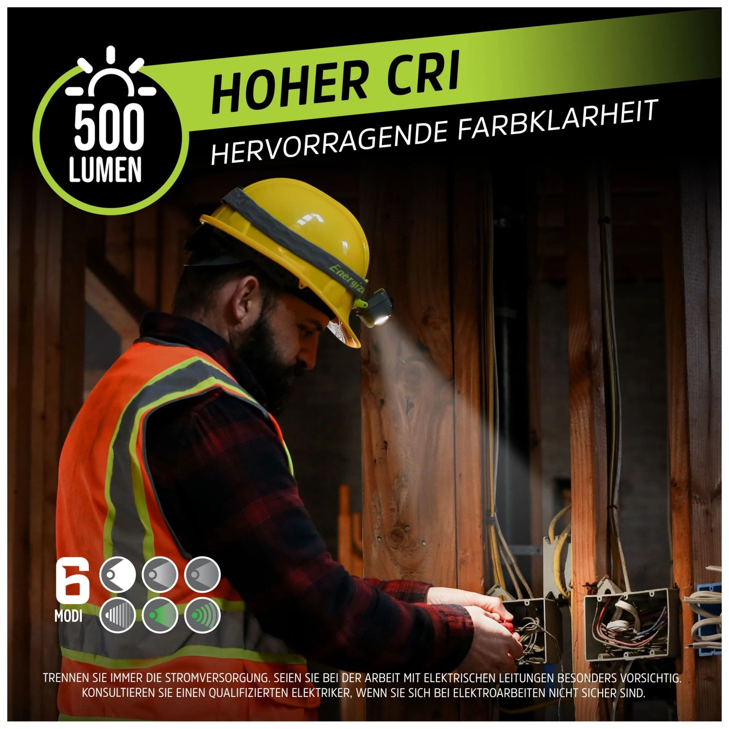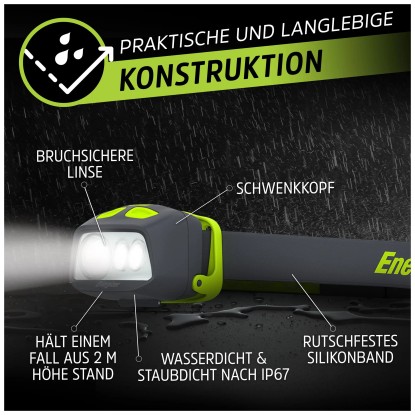Die fokussierende Hybrid-Stirnlampe der Energizer Pro-Serie bietet Ihnen mit 500 Lumen eine leistungsstarke Beleuchtung und lässt Ihre Hände frei für jede Aufgabe. Diese kompakte Stirnlampe ist ideal für Profi- und Heimwerkerprojekte, Camping, Wandern oder Joggen nach Sonnenuntergang. Sie verfügt über einen verstellbaren Riemen und einen schwenkbaren Kopf, der auch die dunkelsten Bereiche ausleuchtet. Mit fünf Lichtmodi - hoch, mittel, niedrig, breit, grün und grün blinkend, passt sie sich Ihren Bedürfnissen an. Die langlebige LED-Technologie bietet 12 Mal helleres Licht als Standard-LEDs. Die Stirnlampe ist wasserdicht, hat eine bruchsichere Linse und hält Stürzen aus 2 Metern Höhe stand. Sie kann mit wiederaufladbaren Batterien oder 3 x AAA-Batterien betrieben werden (im Lieferumfang enthalten).