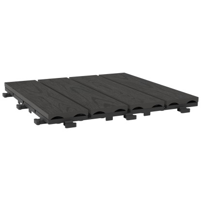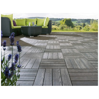 Die Fliese in der Farbe Anthrazit ist in ihrer Oberfläche einer Holzstruktur nachempfunden. Sie wirkt edel und natürlich und macht sich hervorragend insbesondere in modern gestalteten Umgebungen. Ihr Material kann allerdings viel mehr als klassisches Holz: WPC ist eine Mischung aus Holzmehl und Thermoplast mit hochwertigen Eigenschaften. Es ist äusserst pflegeleicht sowie licht- und witterungsbeständig, was Ihre Terrasse oder Ihren Balkon lange zu einem aufwandsfreien Highlight macht. Der Werkstoff ist weiterhin sehr robust - er bildet keine Risse, ist astfrei und splittert nicht. In Kombination mit seiner Rutschfestigkeit ergibt sich der ideale Bodenbelag.