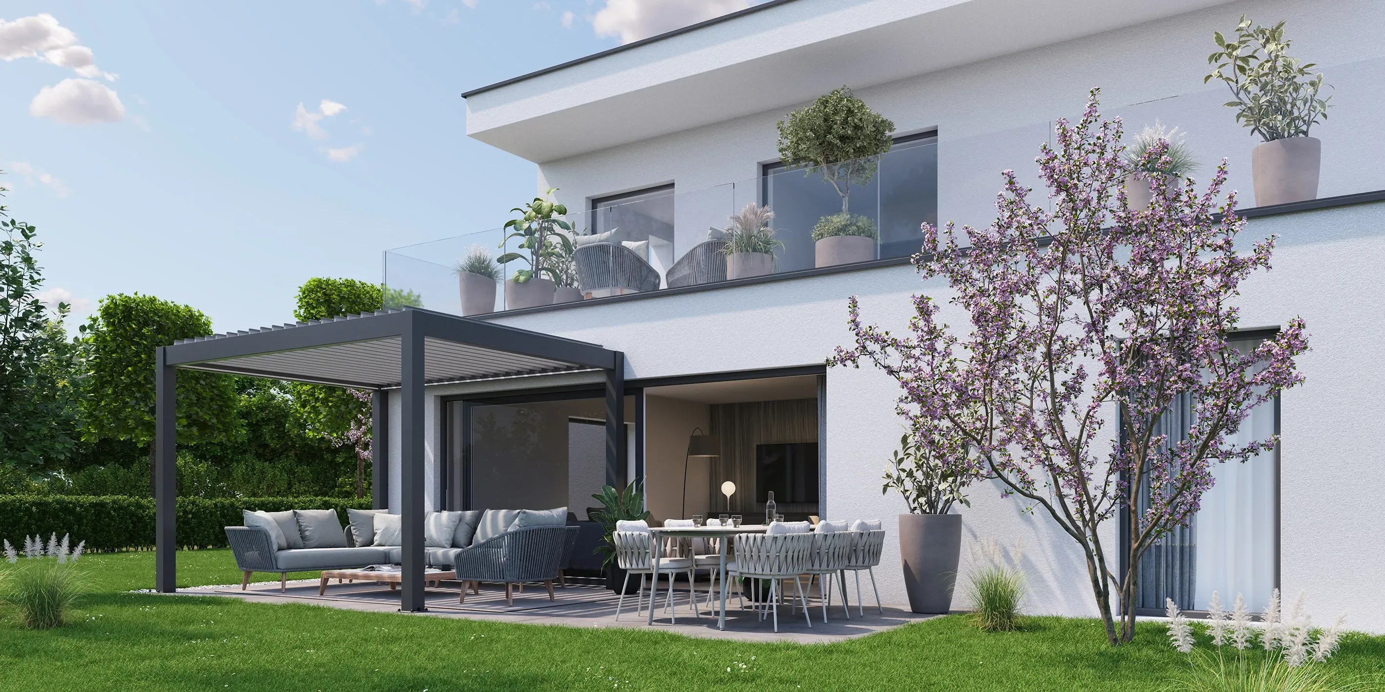 Die Pergola besticht durch ihr zeitgemässes Design und die erstklassige Verarbeitung. Dank der durchdachten Konstruktion und der Sandwichbauweise der Lamellen wird die Wärmeabstrahlung reduziert und die Geräuschentwicklung minimiert. Die 130° verstellbaren Lamellen ermöglichen eine individuelle Steuerung des Schattenwurfs. Ein in den Stehern integrierter Regenwasserabfluss sorgt für zusätzlichen Komfort.