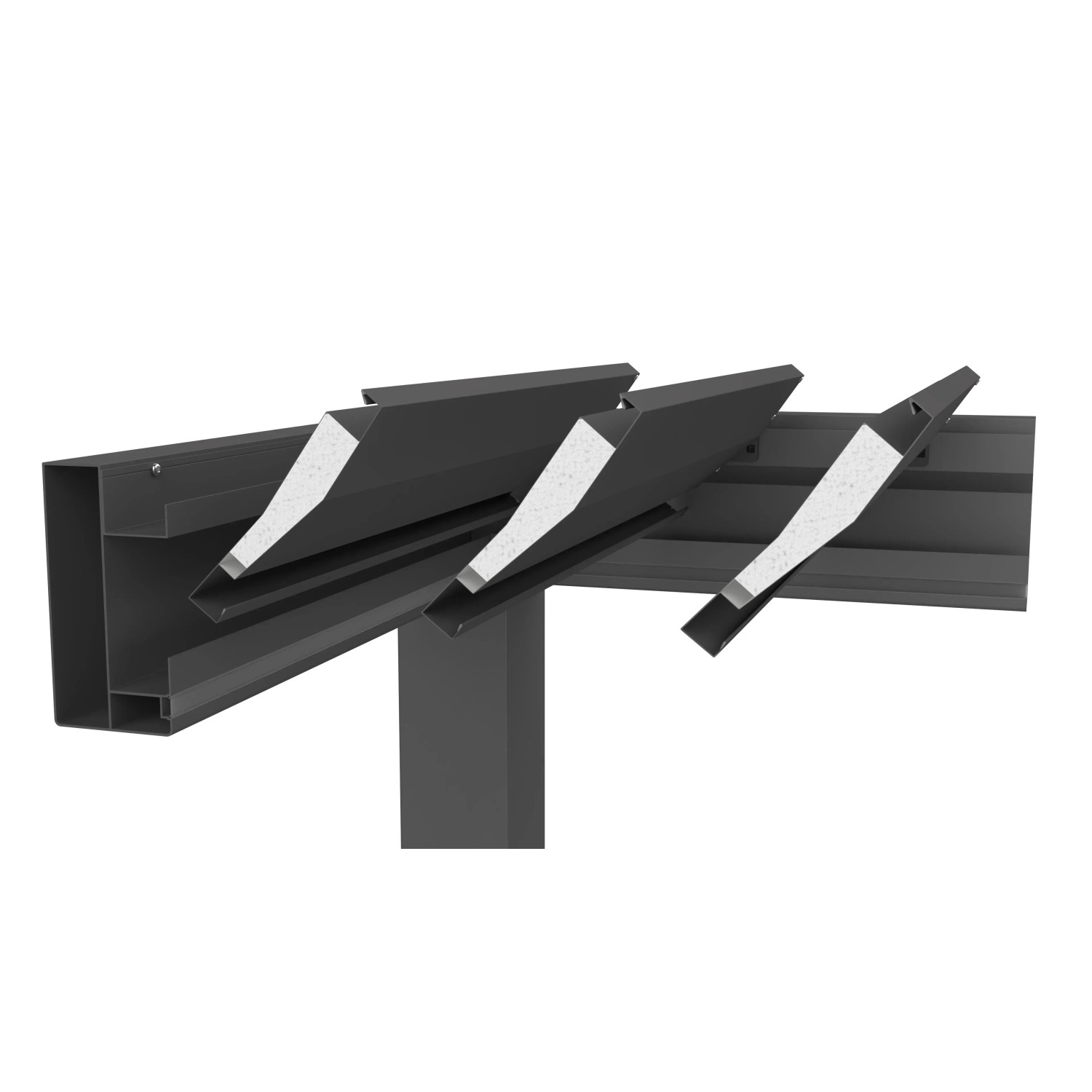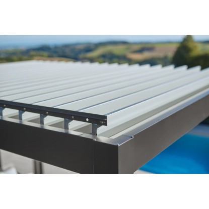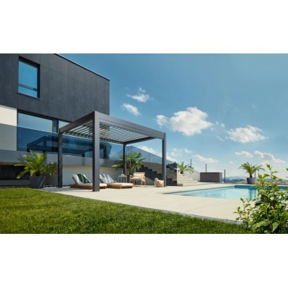 Die Pergola besticht durch ihr zeitgemässes Design und die erstklassige Verarbeitung. Dank der durchdachten Konstruktion und der Sandwichbauweise der Lamellen wird die Wärmeabstrahlung reduziert und die Geräuschentwicklung minimiert. Die 130° verstellbaren Lamellen ermöglichen eine individuelle Steuerung des Schattenwurfs. Ein in den Stehern integrierter Regenwasserabfluss sorgt für zusätzlichen Komfort.