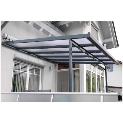Mit dem Gutta Bausatz für eine Terrassen-Überdachung und etwas handwerklichem Geschick ist der Traum vom überdachten Aussensitzplatz so nah wie noch nie. Die langlebige, stabile Konstruktion bietet alle Möglichkeiten für solide Dachkonstruktionen rund ums Haus.Die pulverbeschichtete Aluminiumkonstruktion mit einem transparenten Dach aus Polycarbonat-Hohlkammerplatten, die zur Befestigung einfach in den Sparren eingeklickt werden, macht alles mit und hält Wind und Wetter stand. Zugleich wirkt das Dach dank der schmalen Profilquerschnitte besonders filigran und schlank.Zusätzliche Möglichkeiten bietet das separat erhältliche Erweiterungsmodul von 120 cm Breite. Damit kann das Dach theoretisch unendlich erweitert werden - beispielsweise als Carport über die gesamte Gebäudelänge hinweg, als Unterstellplatz oder Hofüberdachung.Das Dach ist sehr einfach zu montieren und die Dachneigung variabel einstellbar, da die Firsthöhe um bis zu 20 cm und die Position der Trägerpfosten in zwei Richtungen um jeweils bis zu 60 cm verstellbar ist. Das Dach trägt eine Schneelast bis 150 kg/m².