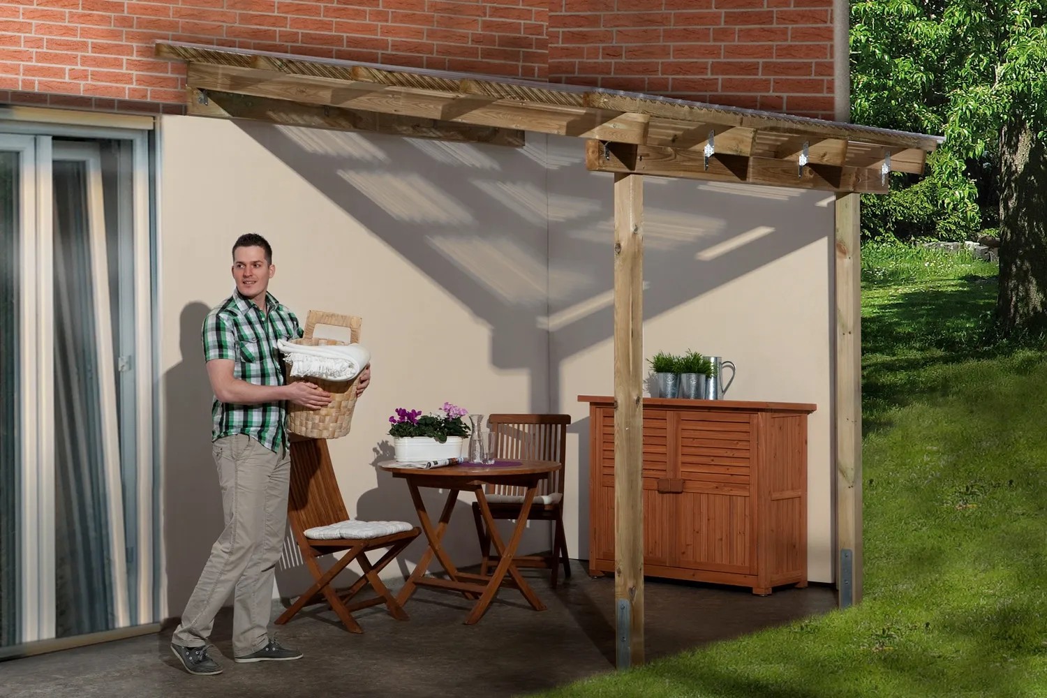 Die Weka Terrassenüberdachung 671 bekommt Stabilität durch zusätzliche Pfettenverbinder. Achten Sie auf die passende Wandbefestigung. Mit Klarsicht-Kunststoffdach, kesseldruckimprägniert, Stabilität durch zusätzliche Pfettenverbinder und Spenglerschrauben mit angeformten Dichtungsscheiben und Abstandshaltern.