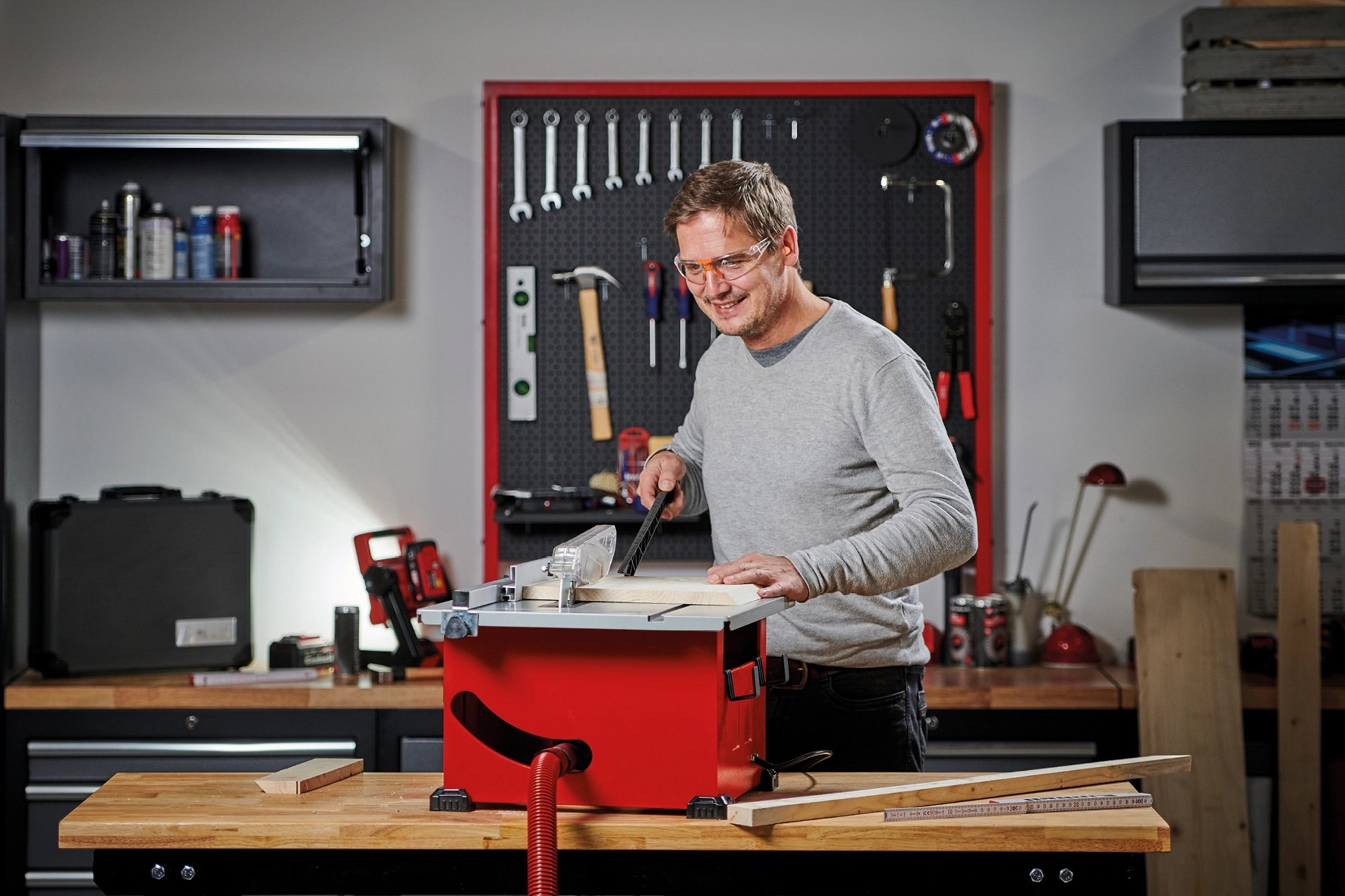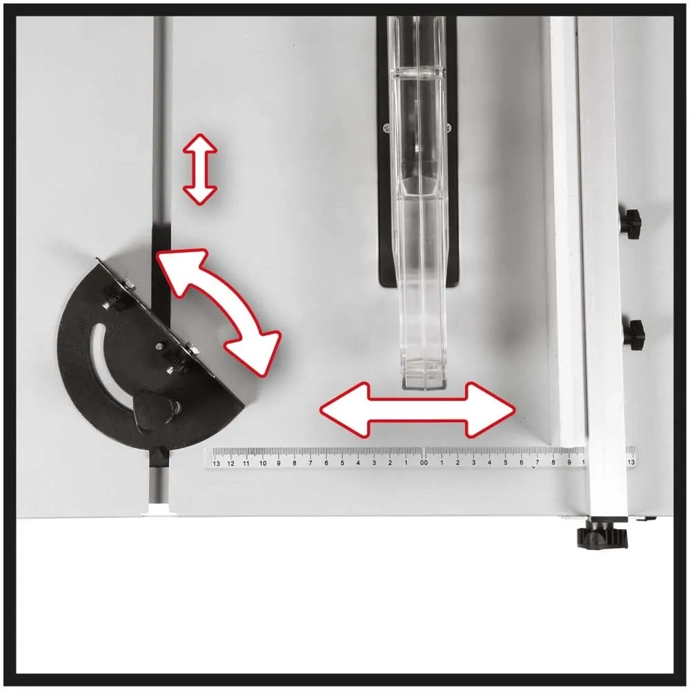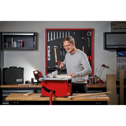 Die Einhell Tischkreissäge TC-TS 210 bietet mit maximal 1'200 W ausreichend Kraft zur präzisen Verarbeitung von Holz im Bau- und Hobbybereich. Dank ihrer kompakten Bauweise ist sie ein praktischer, vielseitiger Helfer. Der Arbeitstisch im Mass von 525 x 440 mm ist mit einer übersichtlichen Skala ausgestattet. Parallel- und Winkelanschlag sorgen für saubere Schnitte. Das mit Hartmetallzähnen bestückte Sägeblatt ist stufenlos höhenverstellbar. Schnitte können im Winkel von 45 bis zu 90° für saubere Gehrungsschnitte stufenlos eingestellt werden. Für ein sicheres Arbeiten sorgt ein Schiebestock, zum Schutz des Motors ist ein Überlastschutz integriert. Die Kunststofffüsse am Metallgehäuse bieten einen sicheren und rutschfesten Stand.