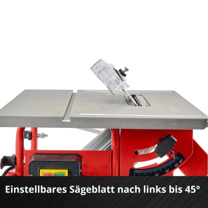 Präzise Gehrungsschnitte werden durch das nach links neigbare Sägeblatt (bis 45°) und den Winkelanschlag (+/- 45°) ermöglicht. Die Tischkreissäge hat eine Schnitthöhe von 45 mm und ist mit einem Parallelanschlag mit beidseitiger Klemmung ausgestattet. Zum sauberen Arbeiten ist ein Späne-Absauganschluss im Gehäuse integriert.