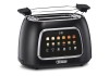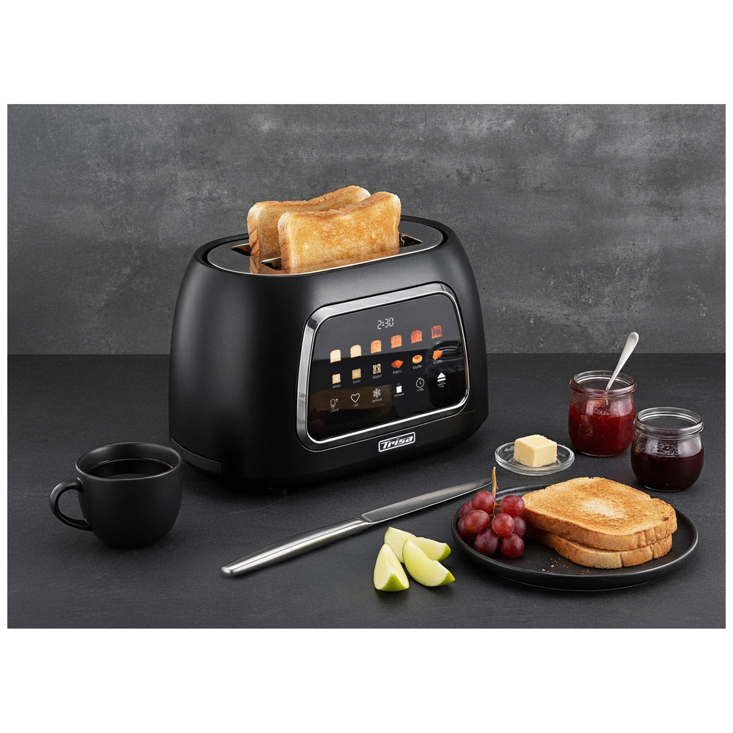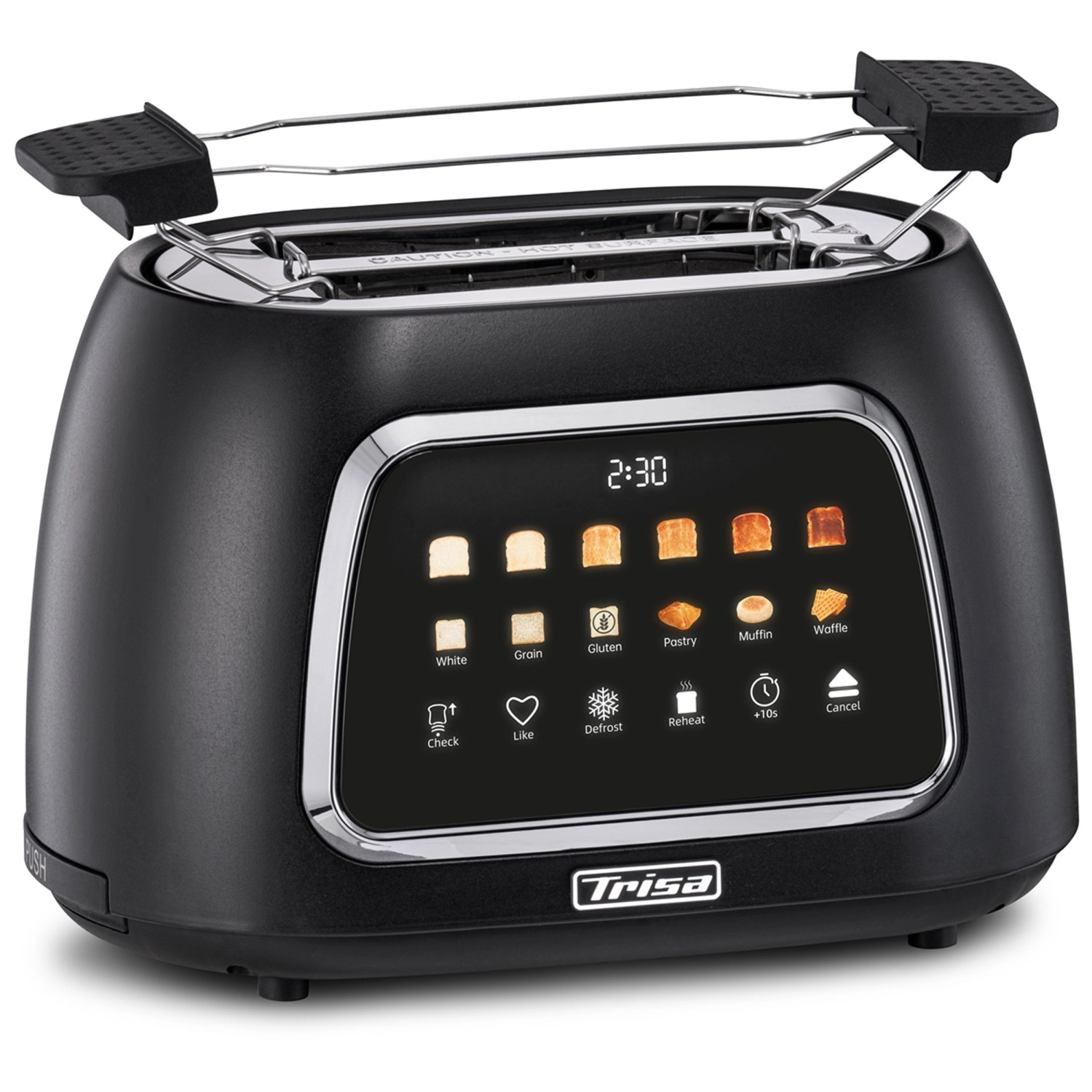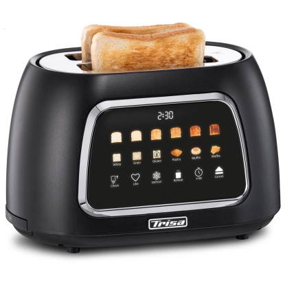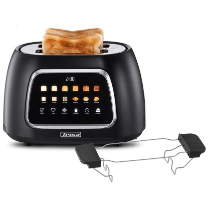 Der Toaster Toast IT von Trisa Electronics überzeugt durch eine intuitive Bedienung über ein modernes Touch-Display, auf dem sich Bräunungsgrad, Brotsorte und weitere Einstellungen individuell auswählen lassen. Der motorisierte Hebemechanismus sorgt zusammen mit der automatischen Zentrierung der Brotscheiben für gleichmässige Resultate. Zusätzlich können persönliche Präferenzen im Favoritenmodus gespeichert werden. Praktische Zusatzfunktionen wie Auftauen, Aufwärmen und eine Zeiterweiterung um 10 Sekunden bieten maximale Flexibilität beim Toasten. Ein integrierter Brötchenwärmer eignet sich ideal zum Erwärmen von Brötchen oder Gebäck. Die herausnehmbare Krümelschublade erleichtert die Reinigung und dank Kabelaufwicklung bleibt die Küche stets ordentlich. Das Gerät arbeitet mit einer Leistung von 800 W und kann mit einer Spannung von 220 bis 240 V betrieben werden.