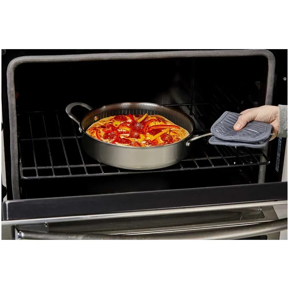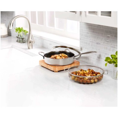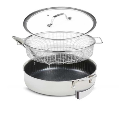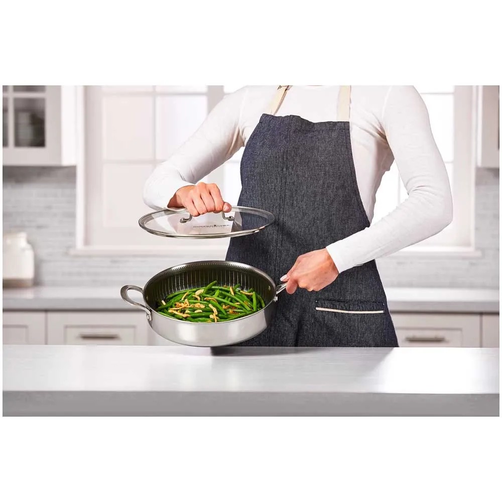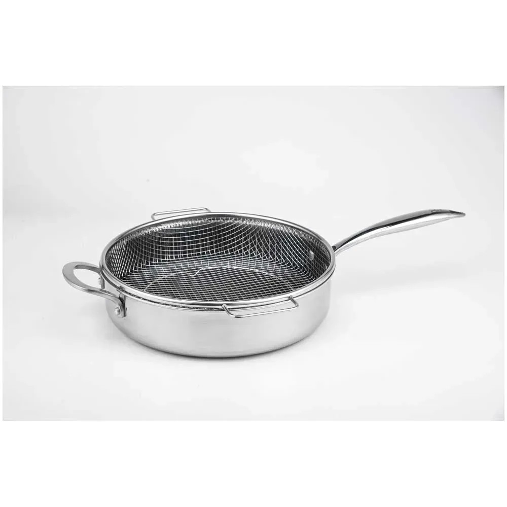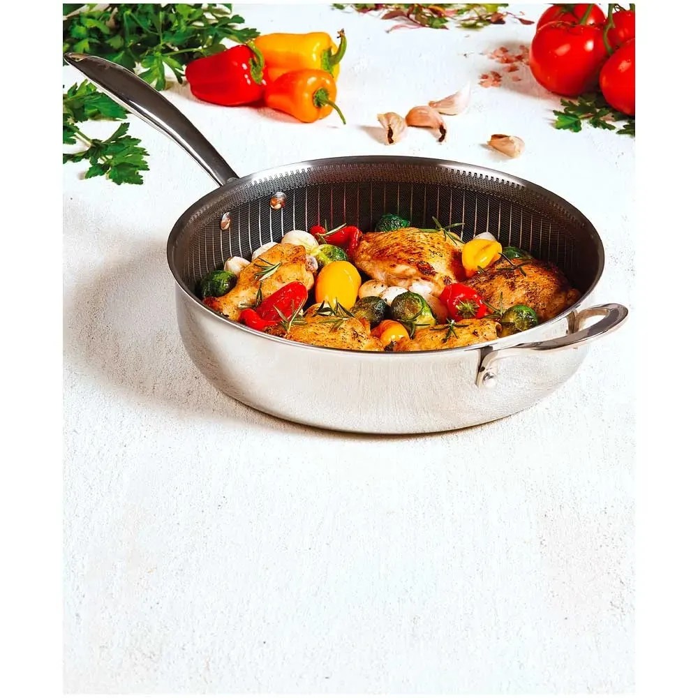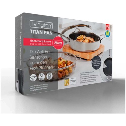 Die Titan Pan von Livington, die Anti-Haft-Sensation unter den Profi-Pfannen, vereint die Vorteile einer Edelstahl- und Anti-Haft-Pfanne. Sie ist ideal zum Kochen, Braten, Backen, Frittieren, Dünsten, Dampfgaren und Rösten. Der Pfannenaufbau besteht aus einem Aluminiumkern zwischen zwei Lagen rostfreiem Edelstahl. So wird eine schnelle und gleichmässige Wärmeleitung garantiert. Die Diamantenpartikel in der Anti-Haft-Beschichtung machen die Pfanne äusserst robust, kratzfest und langlebig. Für schmackhafte Röstaromen und krosse Bratergebnisse sorgt die lasergravierte Edelstahl-Matrix, die in die Anti-Haft-Veredelung eingearbeitet wurde. Dank praktischer Doppelgriffe haben Sie die Livington Titan Pan immer fest im Griff und die extra hohen Pfannenwände ermöglichen das Schmoren grösserer Portionen. Der Gittereinsatz ist perfekt zum krossen Frittieren oder gesunden Dampfgaren ihrer Lieblingsspeisen. Der Sicherheitsglasdeckel und die Pfanne sind hitzebeständig bis +260 °C. Die Livington Titan Pan ist spülmaschinengeeignet und auf allen gängigen Herdarten zu verwenden.