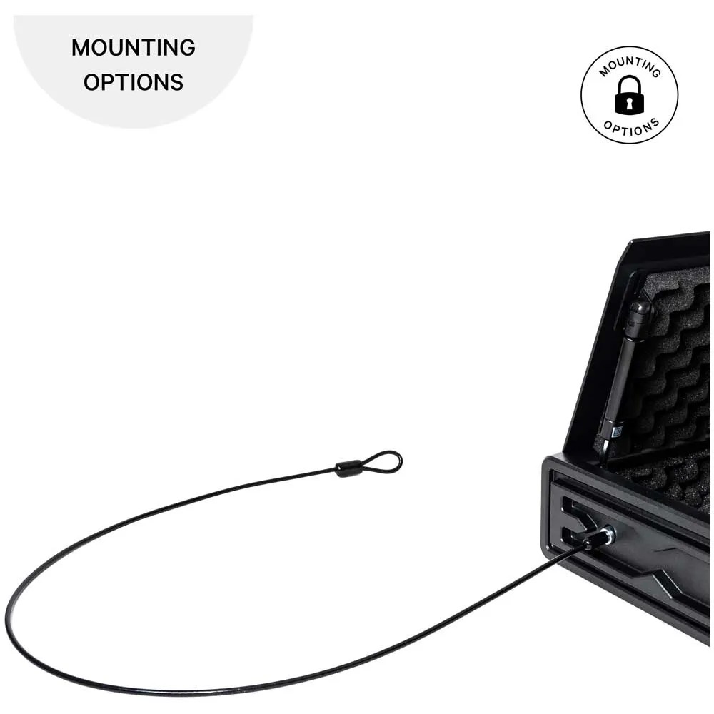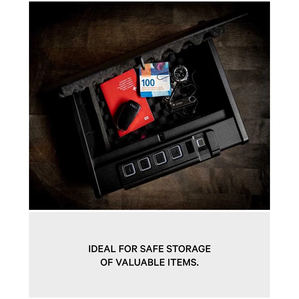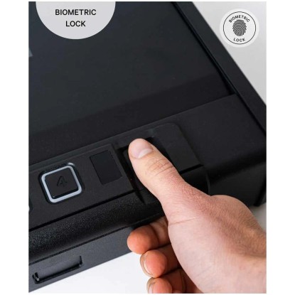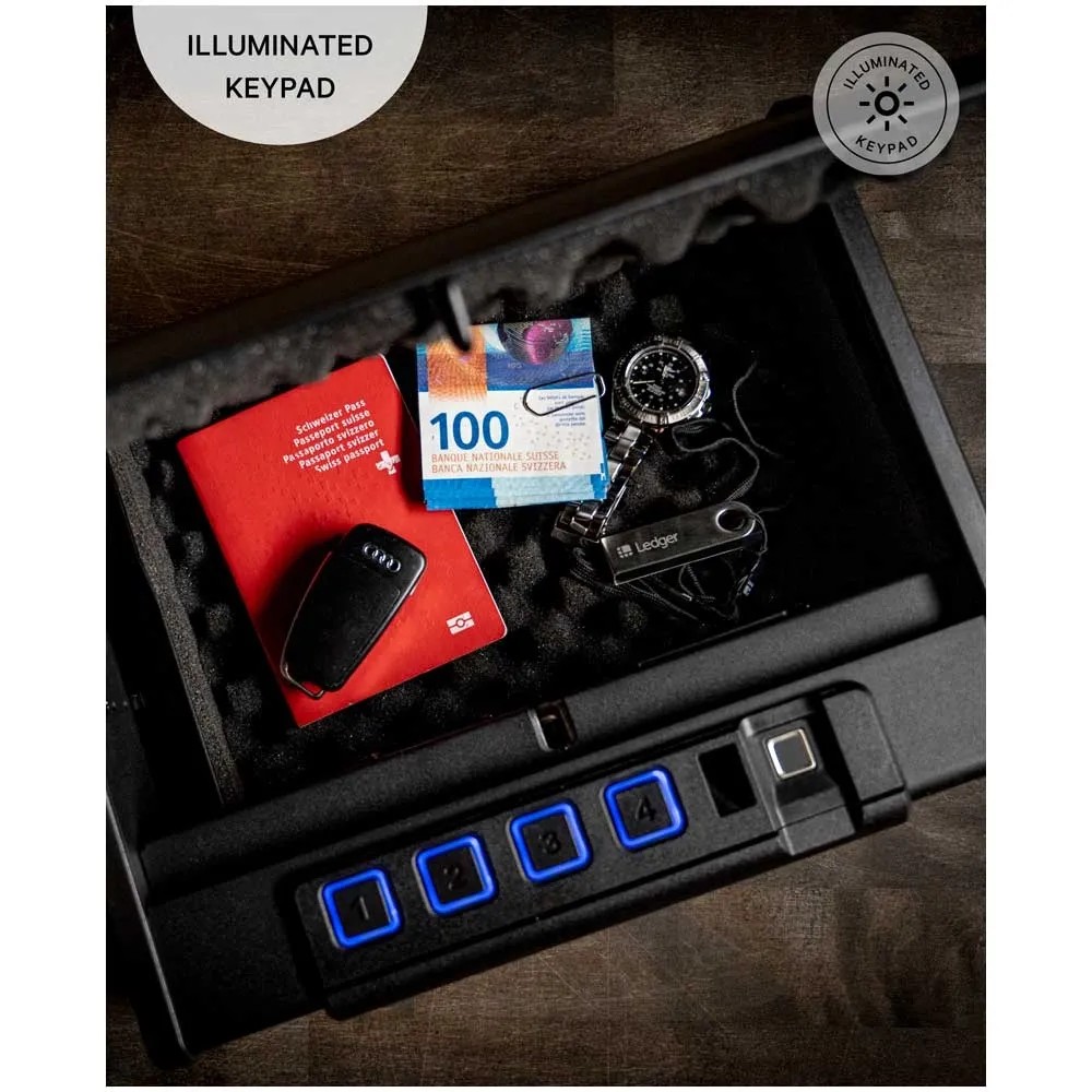 Dank dem lautlosen hydraulischen Öffnungssystem öffnet sich der Deckel nach Eingabe des Fingerabdrucks automatisch und bleibt in geöffneter Position, sodass Sie einen bequemen und schnellen Zugriff auf den Inhalt haben. Ein im Lieferumfang enthaltenes Befestigungs-Stahlseil ermöglicht ein sekundenschnelles und sicheres Verankern des Safes, egal ob zu Hause, im Auto oder auf Reisen. Somit eignet sich die Paladin Sicherheitskassette ideal für die sichere Aufbewahrung von Kurzwaffen, Schmuck, Uhren, Elektronik, Crypto Wallets, Reisepässen oder sensiblen Daten.
