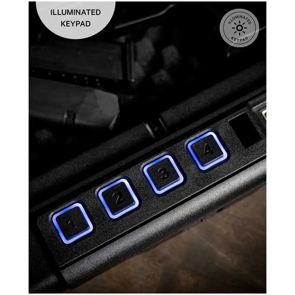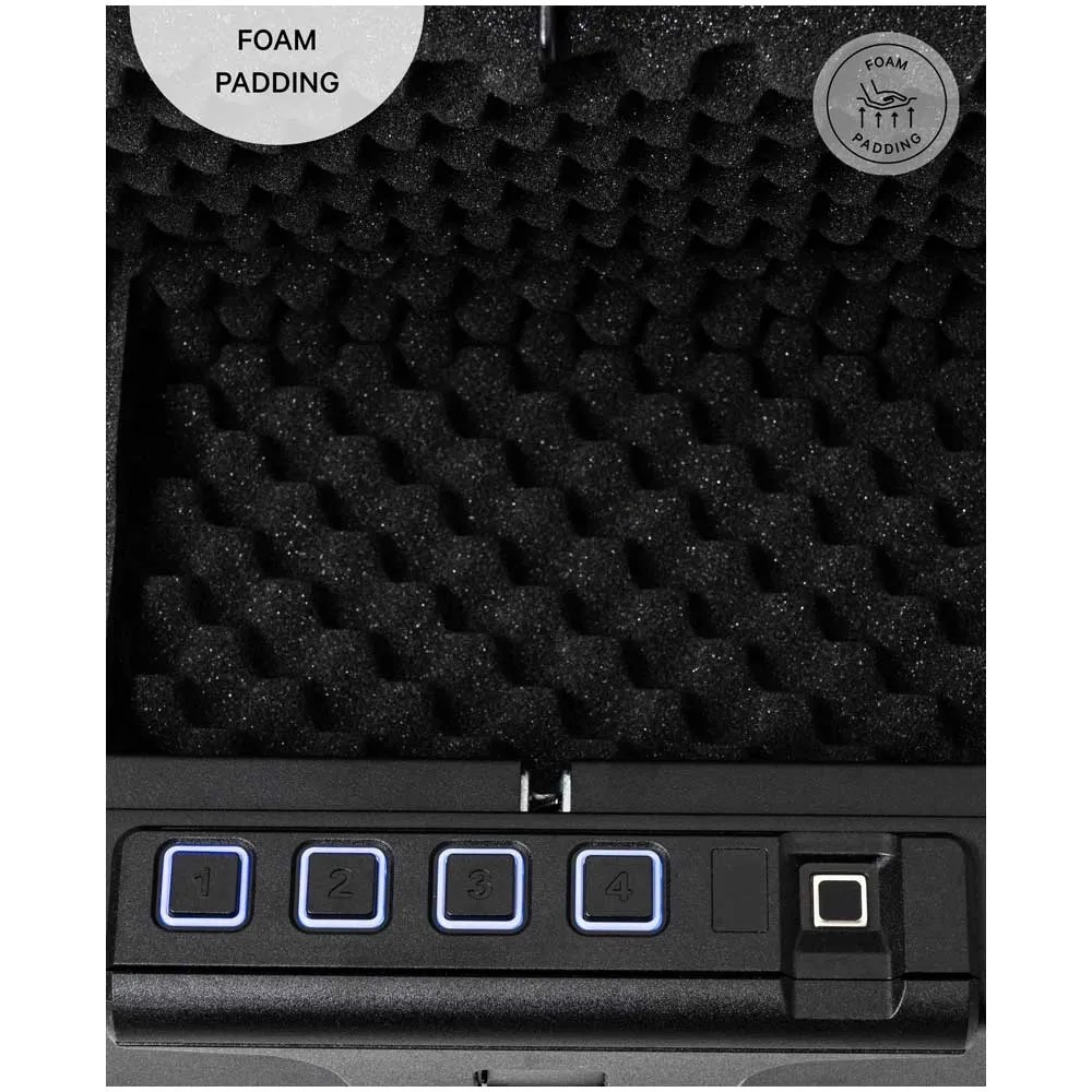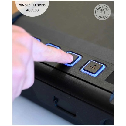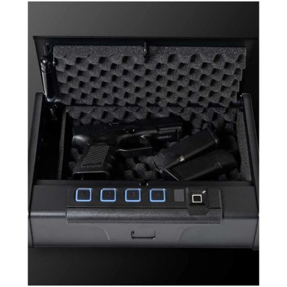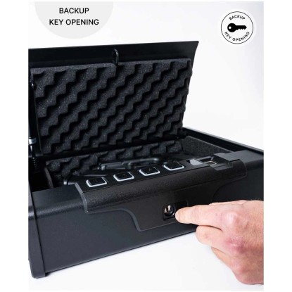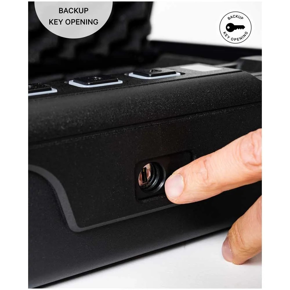 Der Paladin MK2 Pistolensafe verfügt über einen Fingerabdruckleser mit einer Reaktionszeit von unter 0,5 s, welcher einen schnellen und intuitiven Zugriff ermöglicht. Verabschieden Sie sich vom Suchen nach Schlüsseln oder dem Versuch, sich in Stress-Situationen an komplizierte Zugangscodes zu erinnern. Dank der Möglichkeit, bis zu 20 verschiedene Fingerabdrücke zu programmieren, können Sie auch anderen autorisierten Personen Zugriff gewähren, z. B. Familienmitgliedern oder Mitarbeitern. Zudem kann der Safe auch mittels programmierbarer Zahlenkombination oder per Not-Schlüssel geöffnet werden. Der gepolsterte Innenraum schützt Ihre Wertgegenstände vor Kratzern und Beschädigungen, während eine diskrete eingebaute LED-Innenbeleuchtung das Auffinden von Gegenständen bei schlechten Lichtverhältnissen erleichtert. Dank eines integrierten Lautlos-Modus mit deaktivierbaren Tastentönen kann diskret auf den Safeinhalt zugegriffen werden, ohne andere zu alarmieren.