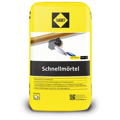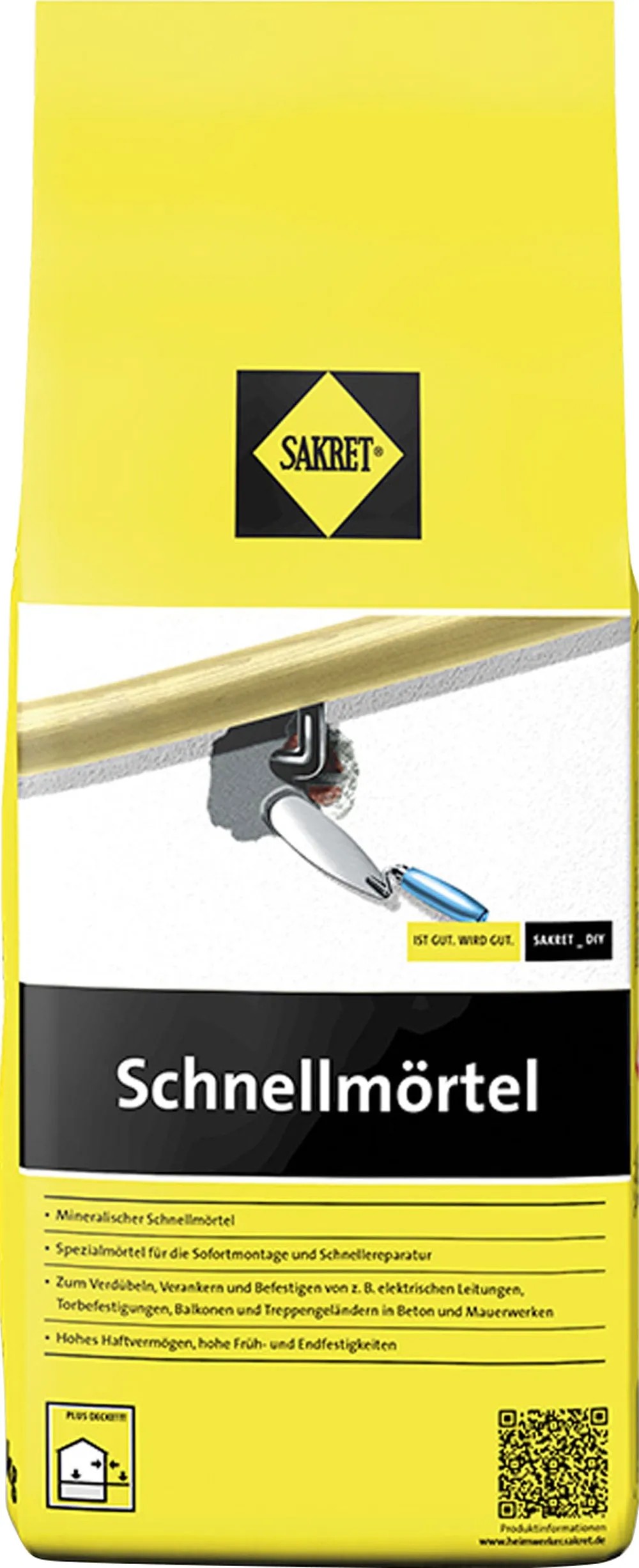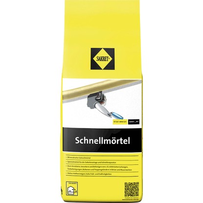 Sakret Schnellmörtel ist ein zementgebundener Spezialmörtel. Er eignet sich zum Verdübeln, Verankern und Befestigen von z. B. elektrischen Leitungen, Torbefestigungen, Balkonen und Treppengeländern in Beton und Mauerwerken.