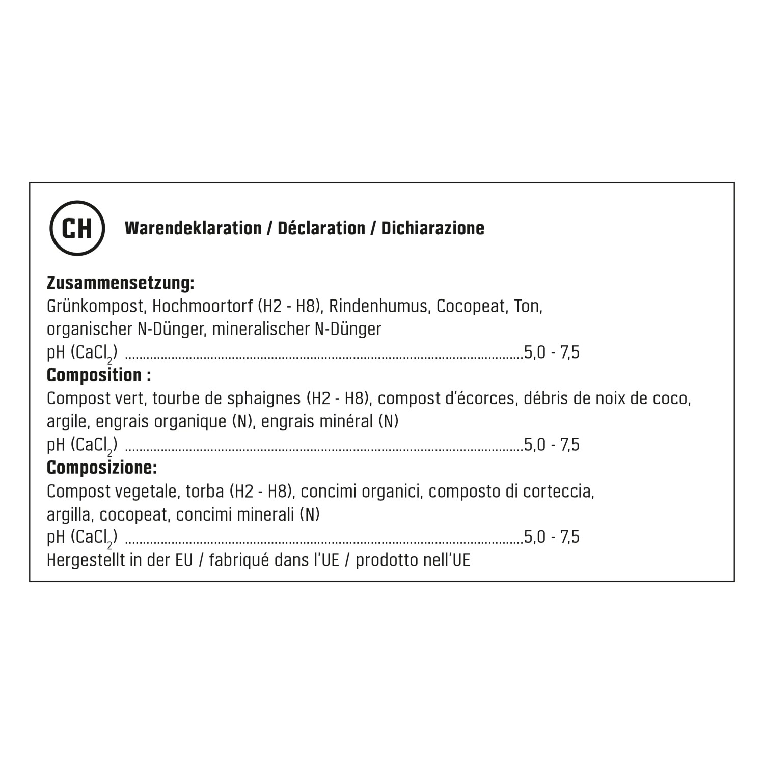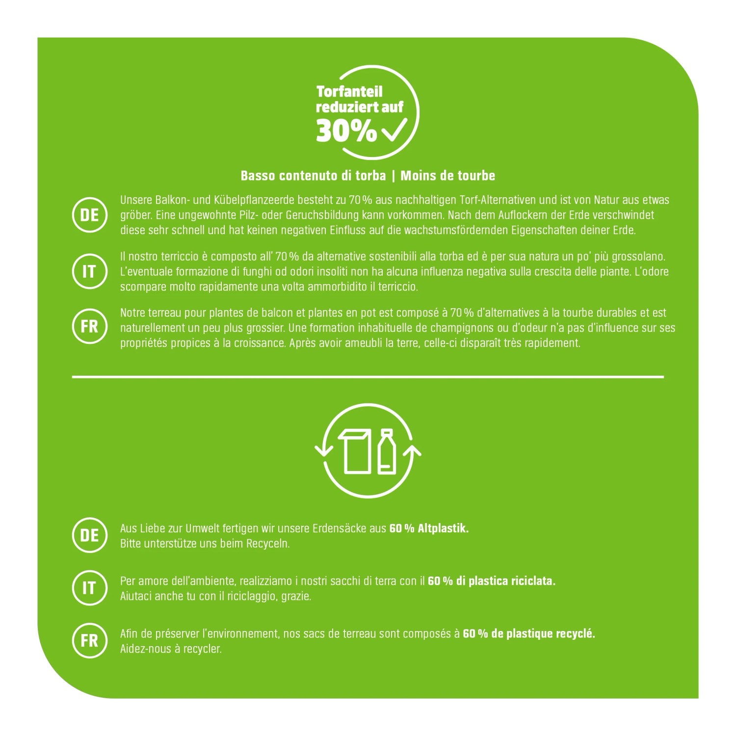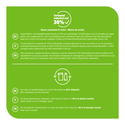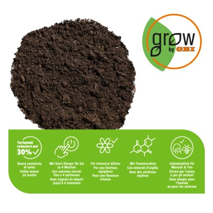 Die GROW by OBI Balkon- und Kübelpflanzenerde eignet sich zum Ein- und Umtopfen mediterraner Kübelpflanzen, Geranien, Petunien und aller Balkonpflanzen.Für ein gesundes Wachstum von Wurzeln und BlütenDie torfreduzierte Blumenerde enthält wertvolle Tonmineralien, die für eine gute Nährstoffspeicherung sorgen. Somit ist eine gleichmässige Versorgung Ihrer Pflanzen mit allen wichtigen Mineralien sichergestellt. Der enthaltene Kompost aus nachwachsenden Rohstoffen verbessert die Luft- und Wasserführung der Erde und sorgt für ein lockeres, durchlässiges Bodengefüge. Dank des bereits enthaltenen Start-Düngers, sorgt die Balkonerde für ein gesundes und kräftiges Wachstum von Wurzeln und Blüten Ihrer Pflanzen.Anwendungsempfehlungen zum UmtopfenVerwenden Sie zum Umtopfen einen etwa 2 cm grösseren Topf als das vorherige Gefäss. Füllen sie ihn zur Hälfte mit frischer Erde und setzen sie die Pflanze in die Mitte des Topfes. Nun können Sie rundherum Erde einfüllen, diese leicht andrücken und dann kräftig angiessen.Folienverpackung aus Recycling-KunststoffDiese Folienverpackung besteht zu ca. 60% aus Recycling-Kunststoffen aus dem gelben Sack. Wir nutzen Post-Consumer-Material um unsere benötigte Verpackung nach dem aktuellen Stand der Technik nachhaltiger zu produzieren. Bitte helfen Sie uns, indem Sie diesen Foliensack wieder dem gelben Sack zuführen.GROW by OBI Profi-TippsSollten Sie den Wurzelballen nicht aus dem Pflanzgefäss ziehen können, fahren Sie mit einem langen Messer am Ballenrand entlang. Die Pflanzen sollten mit möglichst komplettem Wurzelwerk umgetopft werden. Etwa vier Wochen nach dem Einpflanzen können Sie mit der Nachdüngung beginnen. Wir empfehlen GROW by OBI Zitrus- und Kübelpflanzendünger.Sie planen ein grosses Gartenprojekt? Auf Wunsch liefern wir Ihnen diesen Artikel auch als ganze Palette bequem nach Hause. Wählen Sie hierzu einfach die gewünschte Menge im Auswahlfeld neben dem Artikelbild weiter oben aus.