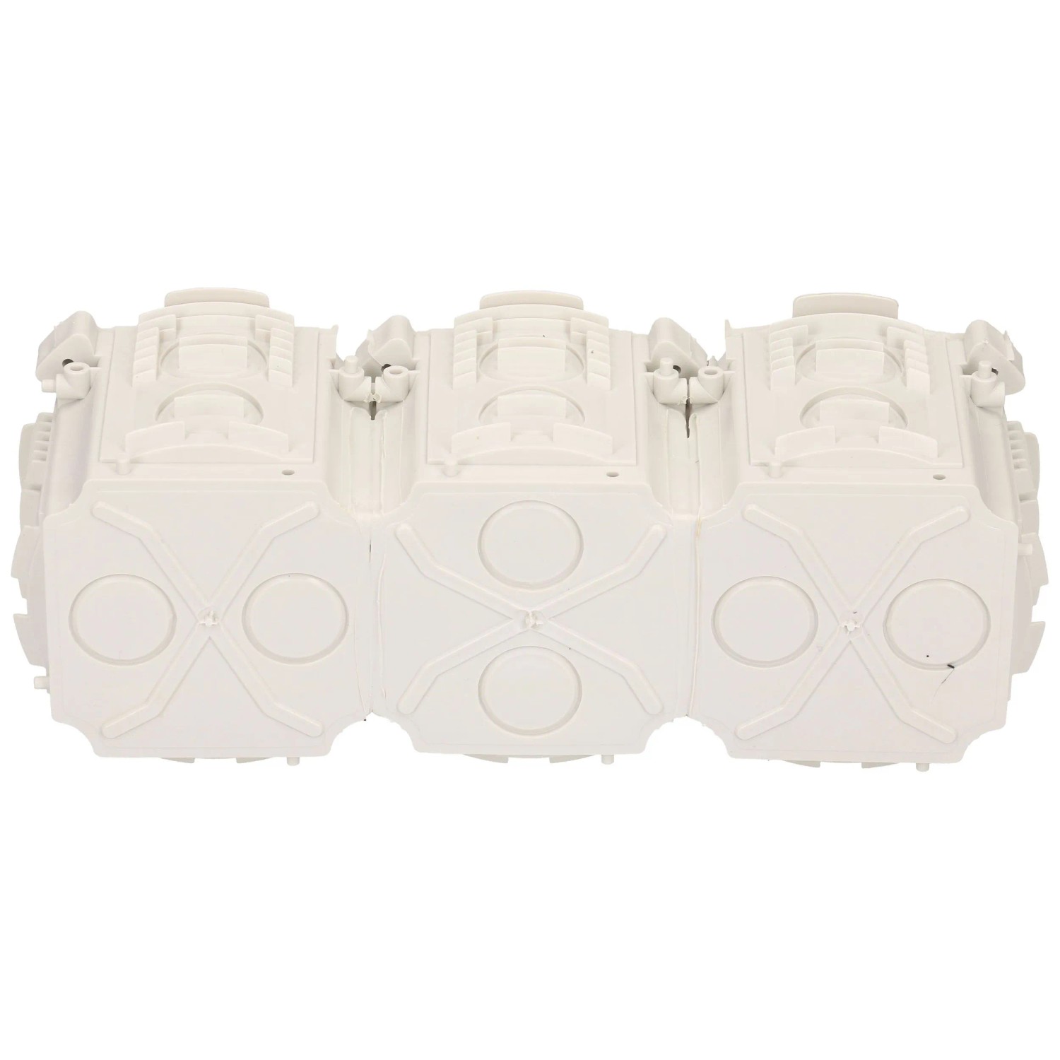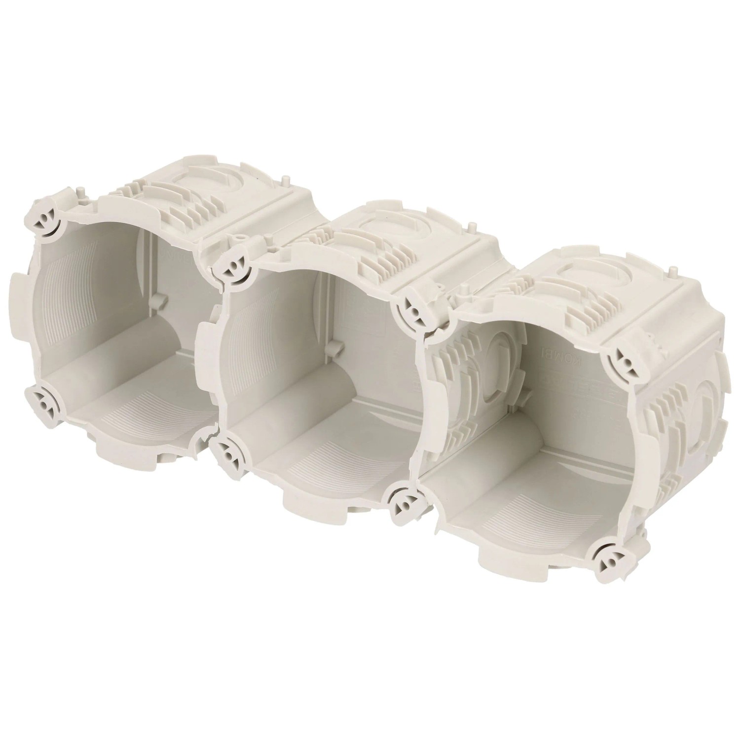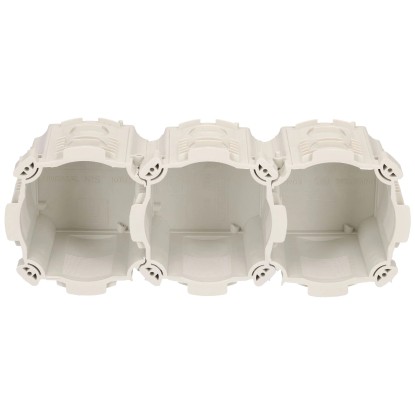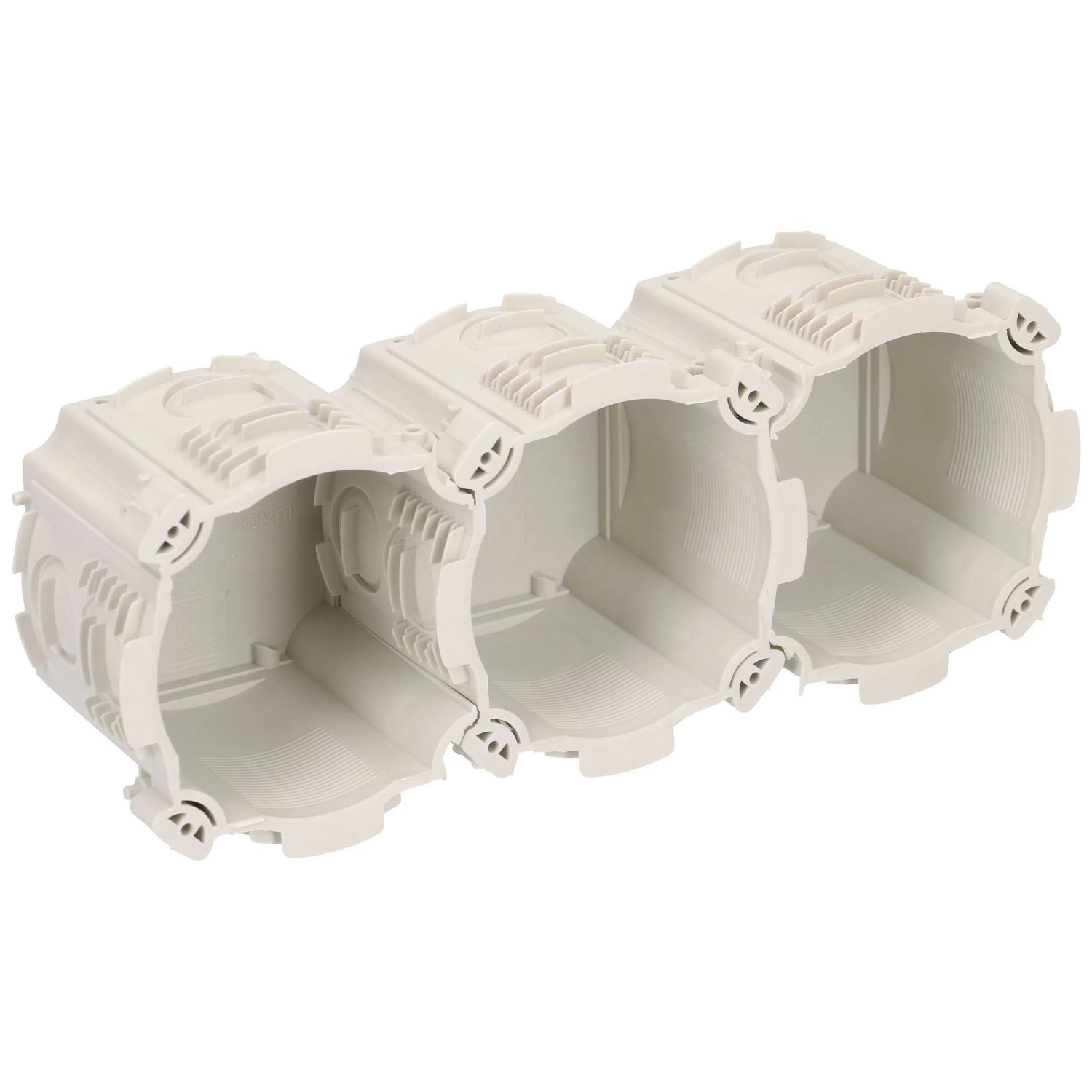 Diese graue Universaldose NIS-Kombi 3-fach passt in ein Bohrloch von 71 mm. Sie hat eine Achsdistanz vom 60mm und eine Einlasstiefe von 58 mm. Die Dose ist für den Mauer- und Holzeinbau geeignet. Das Material ist aus Thermoplast und somit schwerbrennbar.