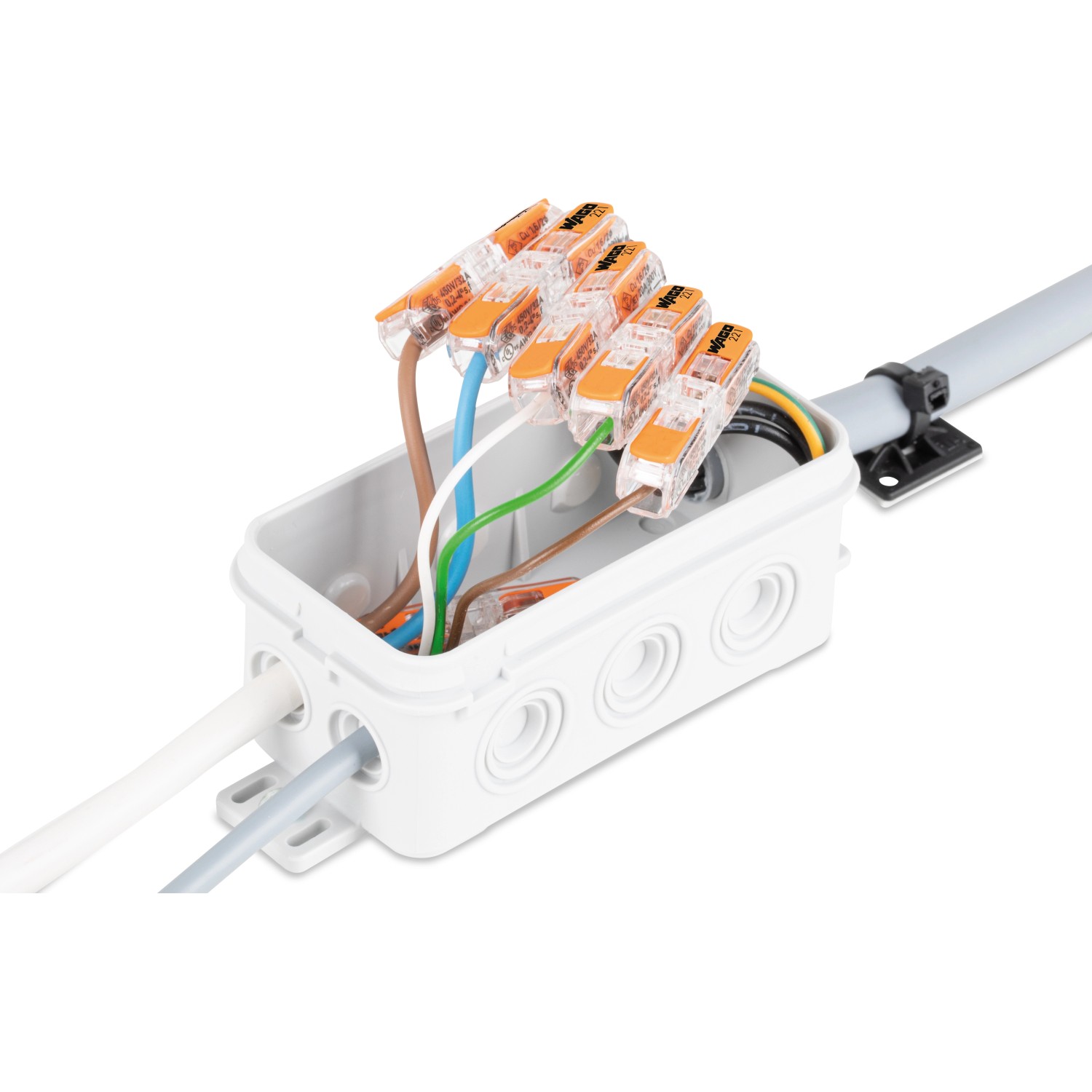 Der Wago Durchgangsverbinder ermöglicht Ihnen die einfache und schnelle Verbindung von Installationsleitungen. Mit der hochwertigen Verbindungsklemme können Sie jede Installationsarbeit mühelos erledigen. Ihre Nennspannung misst 450 Volt. Hergestellt ist sie mit einem Gehäuse aus Kunststoff mit einer Temperaturbeständigkeit bis maximal 85 °C. Das Schraubenmaterial besteht aus langlebigem Metall.