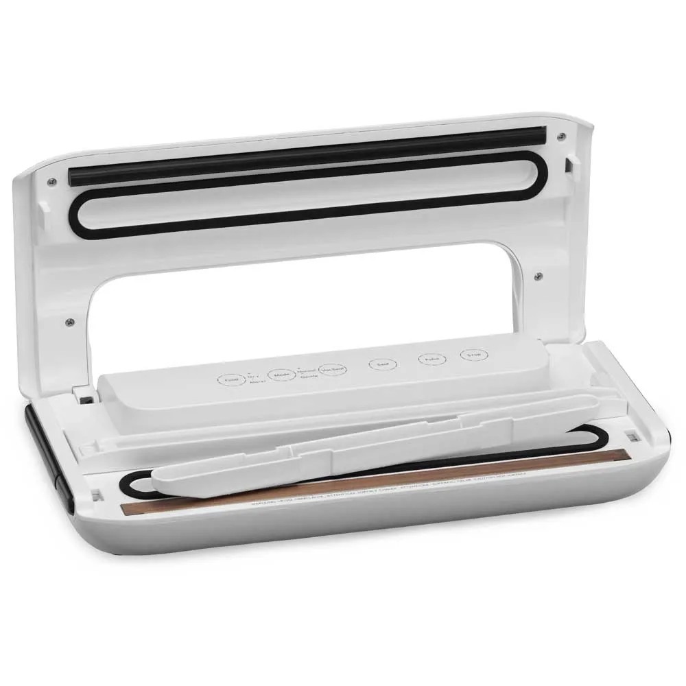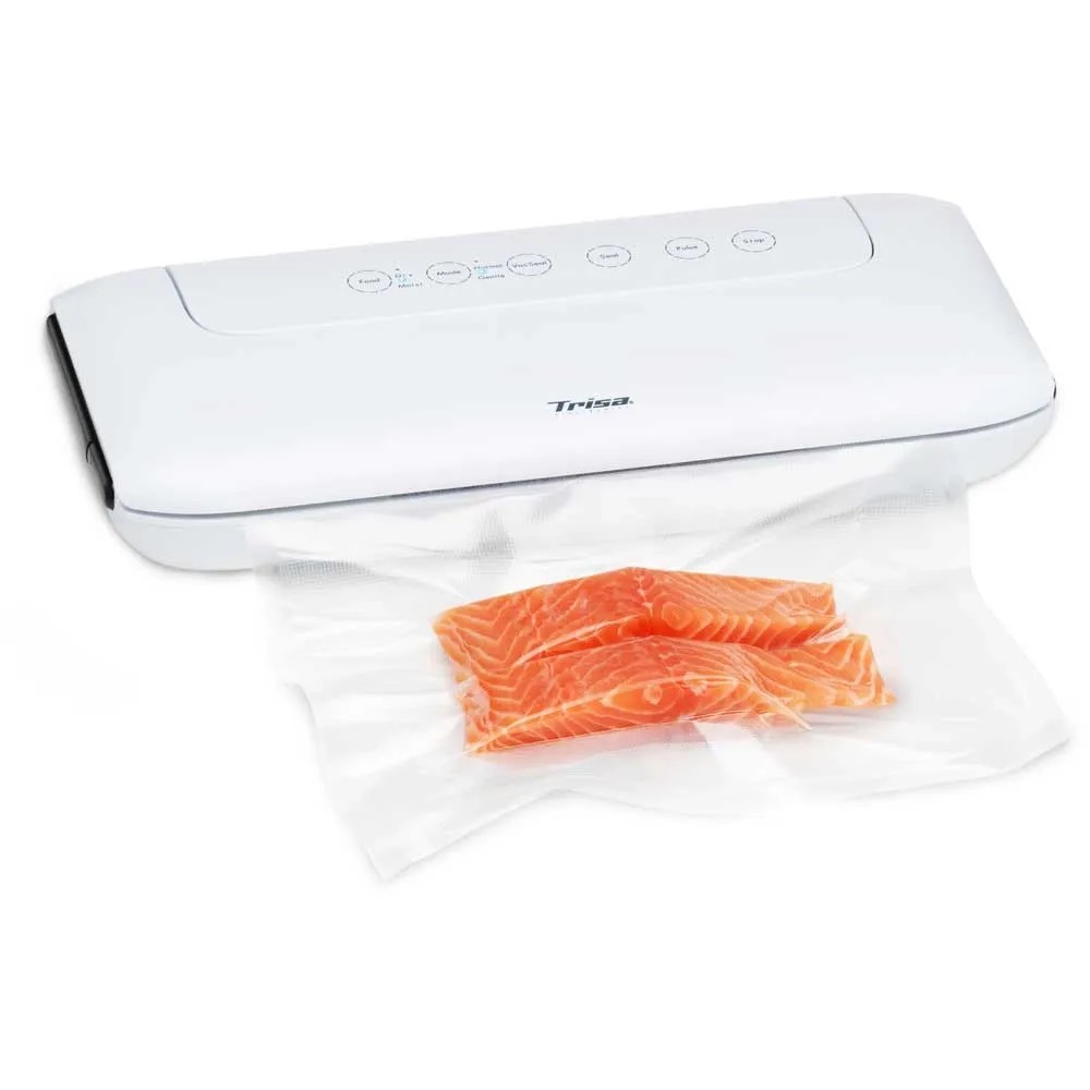 Mit dem Vakuumiergerät von Trisa schweissen Sie Lebensmittel luftdicht ein und verlängern so ihre Haltbarkeit, während wertvolle Vitamine enthalten bleiben. Das ist eine effektive Methode, um Obst, Gemüse, Hartkäse, Fisch und Fleisch übersichtlich zu bevorraten und der Verschwendung von Lebensmitteln entgegenzuwirken. Die Vakuumierung und Versiegelung erfolgt automatisch mit kraftvollen -0,8 bar.