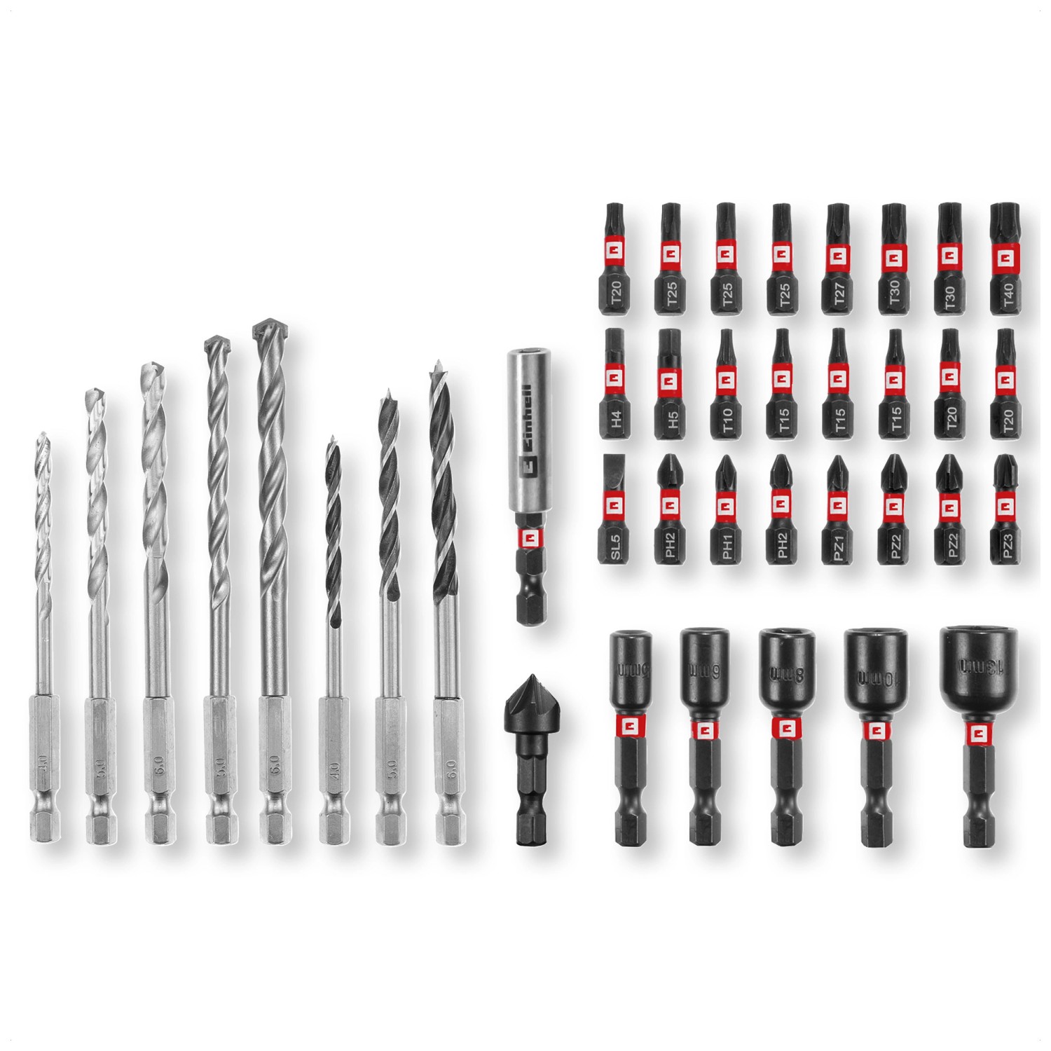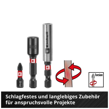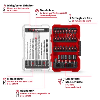Das Bit- und Bohrer-Set Mix im M-Case von Einhell ist ein vielseitiges Set für diverse Anwendungsbereiche. Es enthält 24 schlagfeste Bits aus S2-Stahl, drei HSS-Metallbohrer, drei Holzbohrer aus C45-Werkzeugstahl und zwei Steinbohrer mit Hartmetallplatte. Fünf schlagfeste Steckschlüssel und ein Bithalter aus Karbonstahl ergänzen das Set. Der mitgelieferte Senker besitzt sechs Schneiden und eignet sich für präzises Arbeiten.