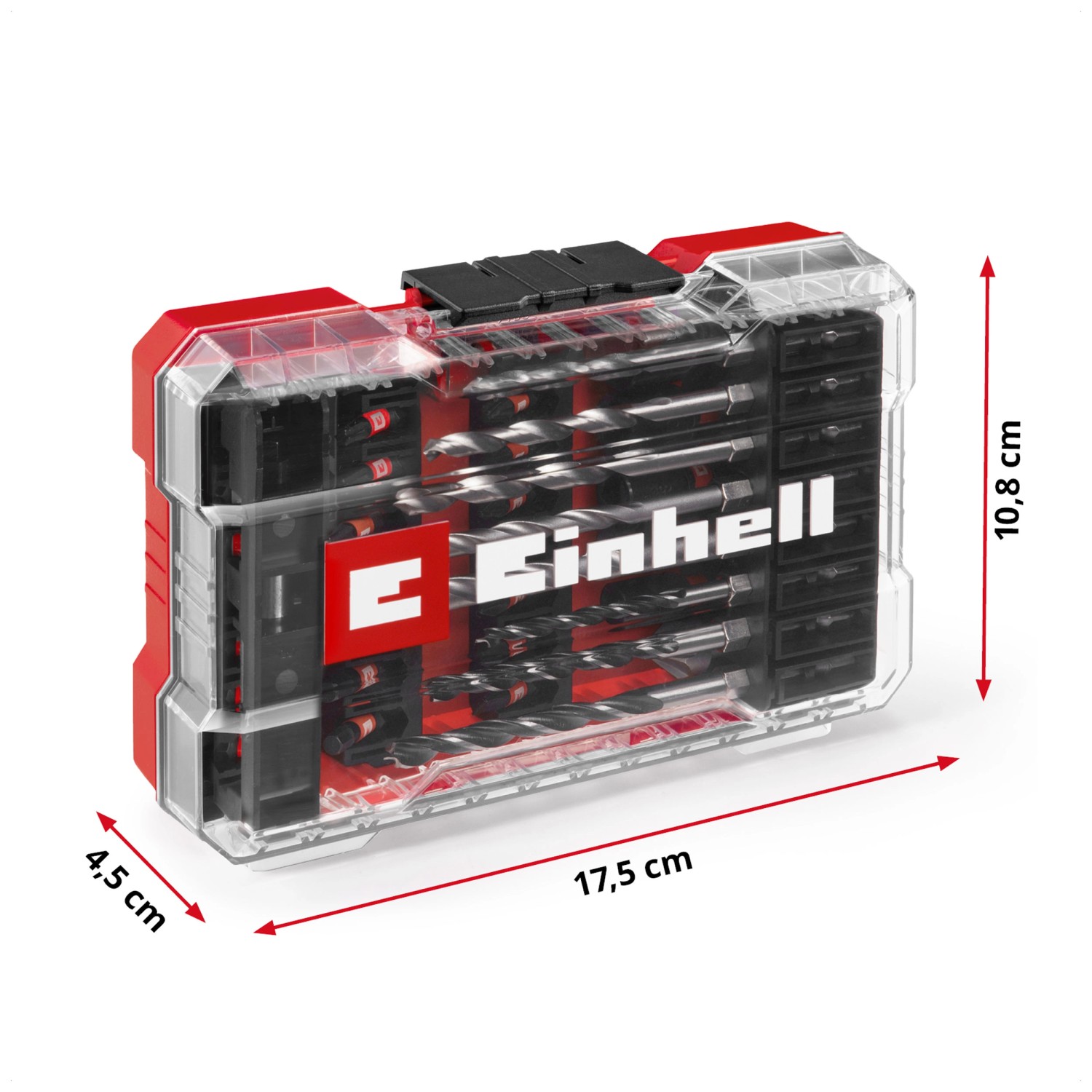 Die praktische Aufbewahrungsbox mit Auto-Lock-Clip-Verschluss sorgt für eine sichere Lagerung. Der transparente Deckel ermöglicht eine schnelle Sichtbarkeit des Inhalts. Ideal geeignet für den Einsatz in Akkuschraubern und Bohrmaschinen, unterstützt dieses Set effizient in Projekten mit Holz, Metall, Kunststoff und Stein.