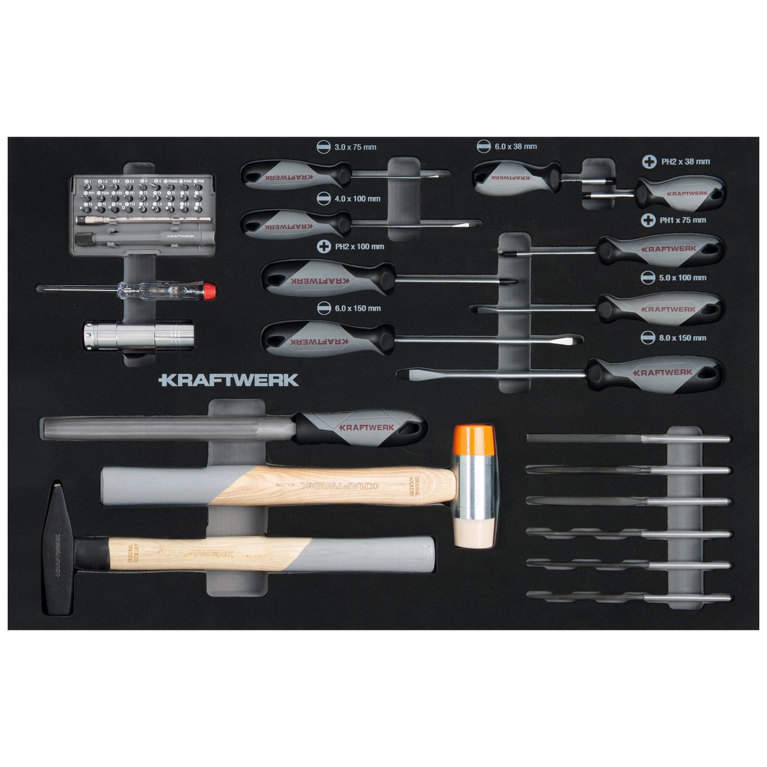 Das Kraftwerk Schraubendreher- und Schlagwerkzeug-Set umfasst insgesamt 49 Teile und bietet eine vielfältige Auswahl an Werkzeugen für präzises Arbeiten. Enthalten sind verschiedene Schraubendreher in mehreren Grössen für Schlitz- und Phillips-Schrauben, ein Phasenprüfer für Spannungen von 110 bis 250 V, ein DIN-Schlosserhammer, ein Plastikhammer sowie ein 6-teiliges Nadelfeilenset. Ebenfalls im Set enthalten sind eine 9 LED-Taschenlampe aus Aluminium (ohne 3 x AAA-Batterien) sowie eine Flachstumpf-Feile. Das Set eignet sich ideal für den professionellen wie auch privaten Gebrauch und sorgt mit einer passgenauen Einlage für eine strukturierte und platzsparende Aufbewahrung. Die robuste Verarbeitung sorgt für eine lange Lebensdauer und Zuverlässigkeit bei regelmässigem Einsatz.