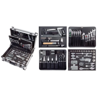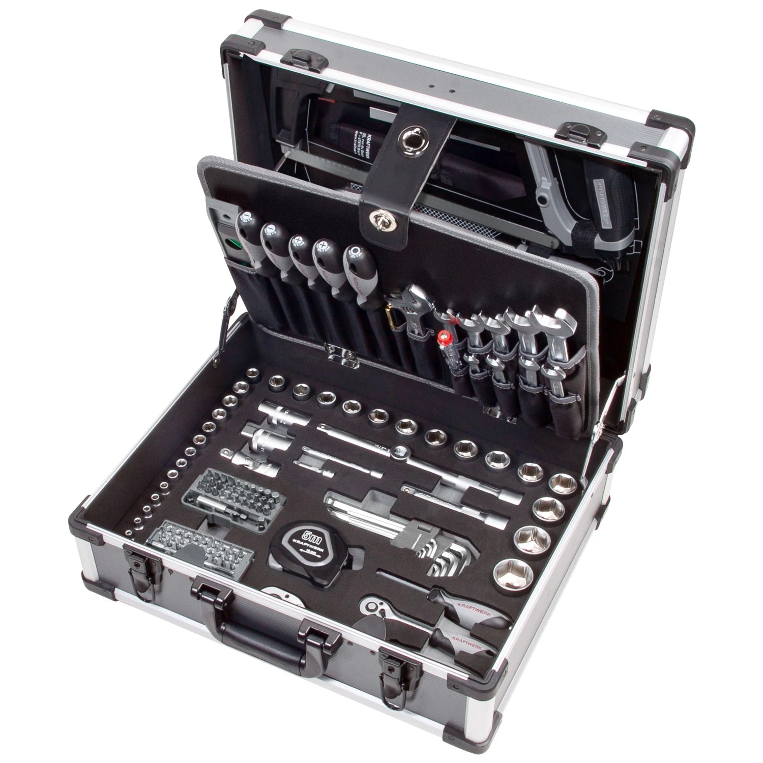 Der Werkzeugkoffer Basic Line B147 1/4" + 1/2" von Kraftwerk Schweiz AG bietet eine umfassende Grundausstattung für vielfältige Einsatzbereiche. Mit 158 Teilen, darunter sowohl 1/4"- als auch 1/2"-Steckschlüssel-Einsätze und Umschaltknarren, ist dieser Koffer perfekt für professionelle und heimwerkliche Arbeiten geeignet. Die enthaltenen Werkzeuge wie Ring-Maulschlüssel, Zangen, Schraubendreher und eine Rohrzange decken ein breites Spektrum an Anwendungen ab. Zusätzlich bietet der Koffer praktische Extras wie eine Wasserwaage, ein Rollmeter und eine Knie- und Sitzunterlage für komfortables Arbeiten. Der stabile Koffer ist ideal zum sicheren Aufbewahren und Transportieren der Werkzeuge.