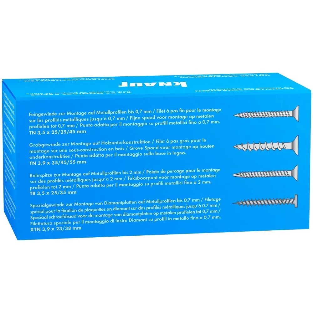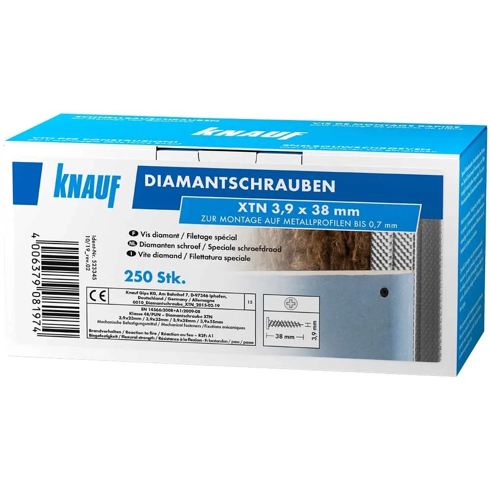 Die Knauf Diamantschraube XTN benötigen Sie, um die Hartgipsplatte Knauf Diamant an einer Metallunterkonstruktion zu befestigen. Diese Unterkonstruktion darf maximal 0,7 mm stark sein. Das trifft beispielsweise auf nichttragende Innenwände, Deckenbekleidungen, Vorsatzschalen, Doppelständerwerk oder Installationswände zu, bei deren Montage Knauf Ständer-Profile CW-dB, Knauf Rahmenprofile UW-dB oder Knauf Deckenprofile CD verwendet werden. Weiteren Einsatz findet diese Diamantschraube bei einlagigerBeplankung von Knauf Diamant-Platten 12,5 mm auf Holzunterkonstruktionen.