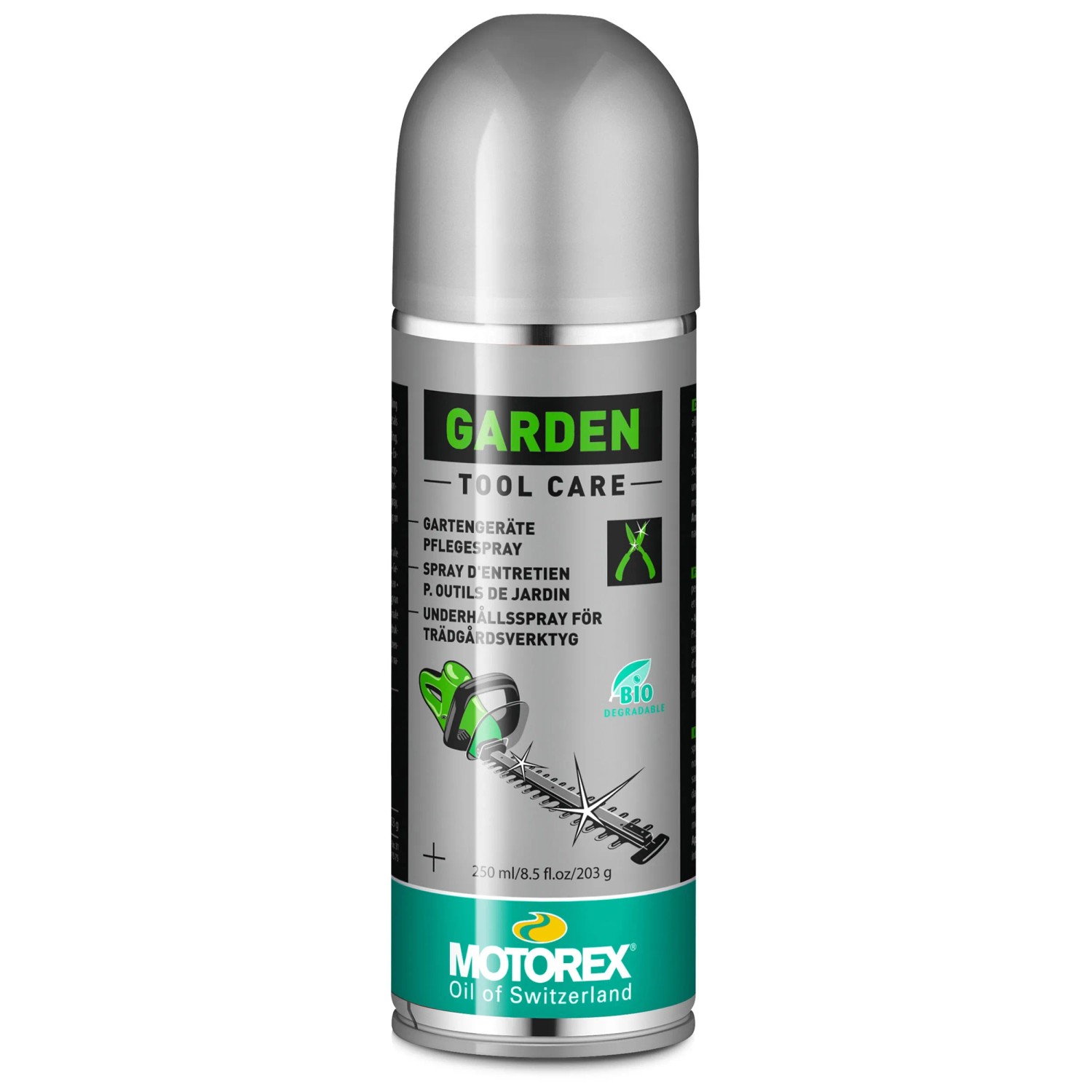Das Motorex Garden Tool Care Pflegespray für Gartengeräte ist ein vielseitiges Pflegespray, das speziell für die Reinigung, Schmierung und Konservierung von Gartengeräten und Werkzeugen entwickelt wurde. Mit einer Füllmenge von 250 ml bietet es sehr guten Korrosionsschutz und optimale Schmiereigenschaften. Das Spray verhindert wirkungsvoll das Quietschen von Klingen, Metallteilen und Gelenken und zeichnet sich durch seine sehr gute Materialverträglichkeit aus. Es ist als Pumpspray ausgeführt und eignet sich für Gartengeräte aller Art.