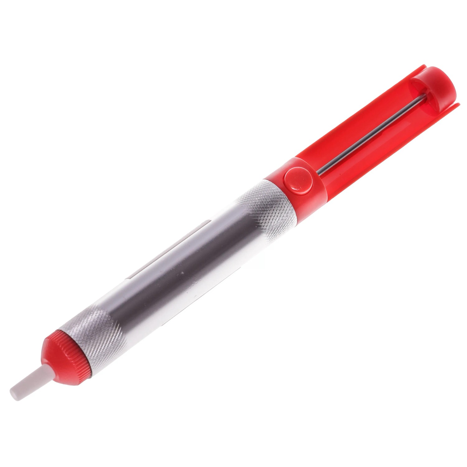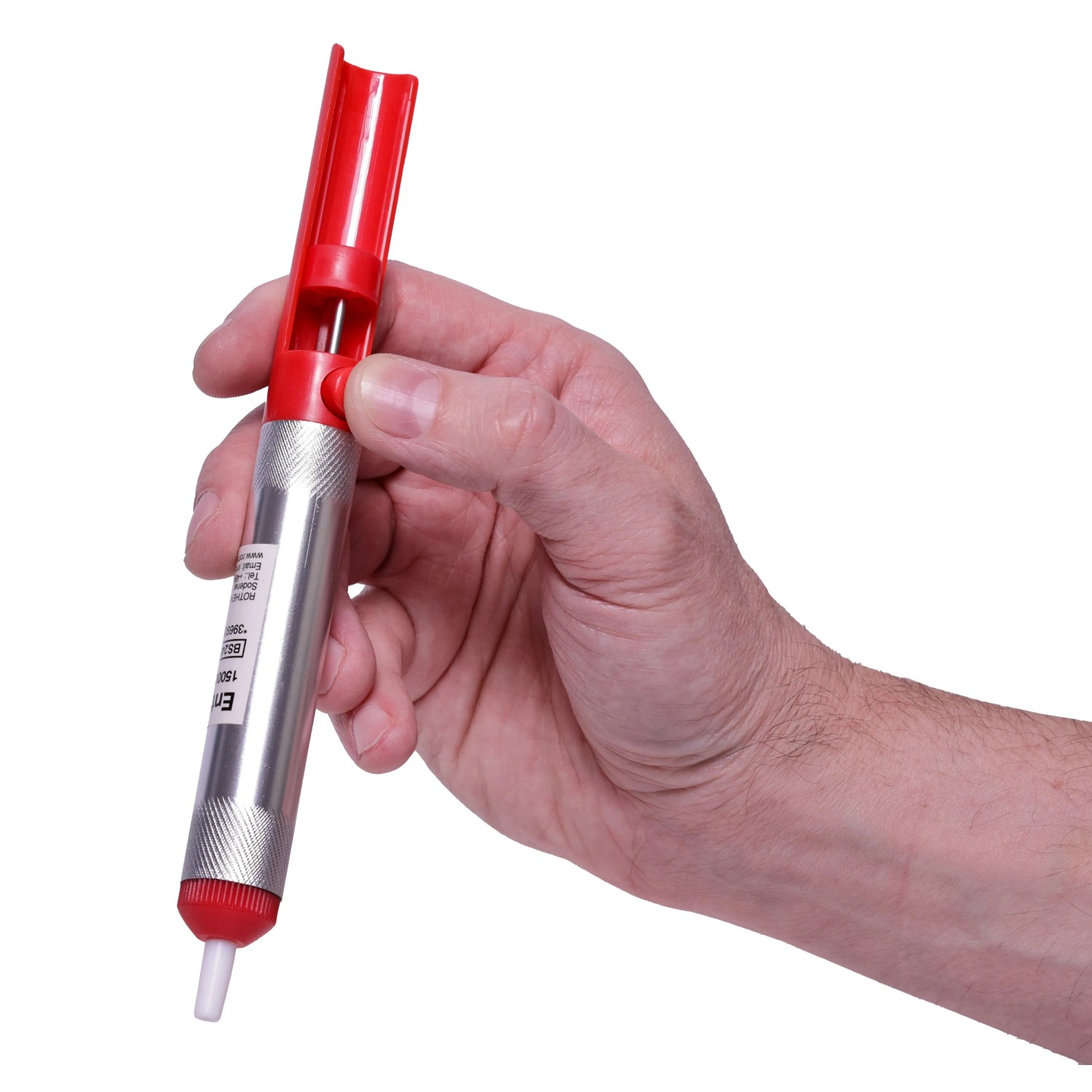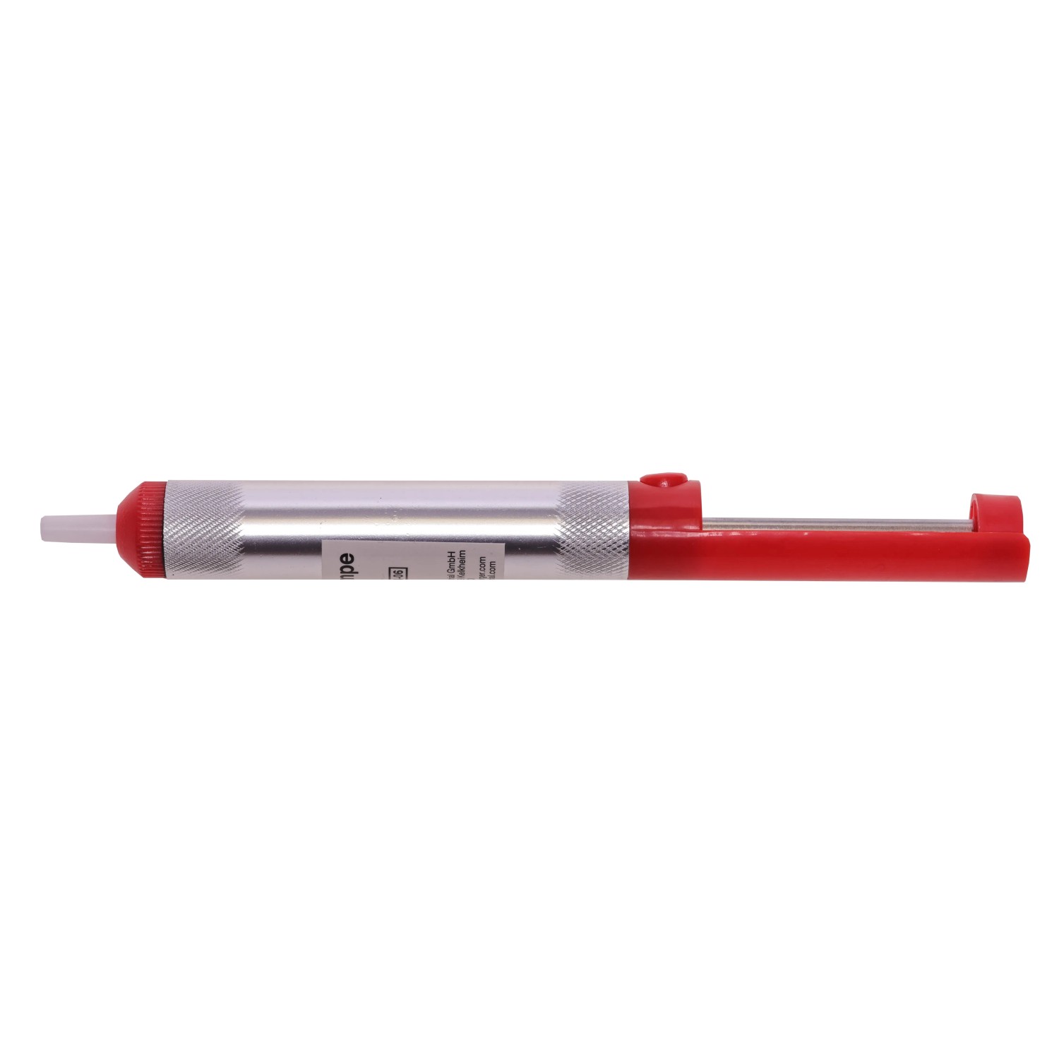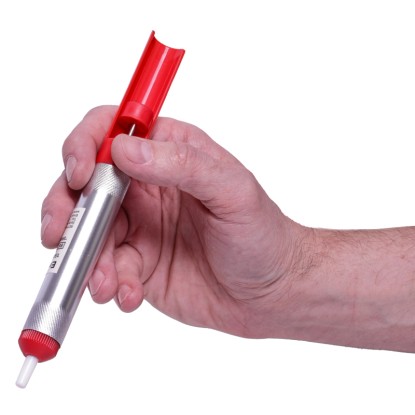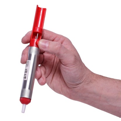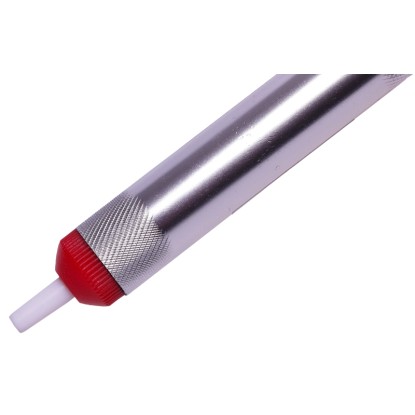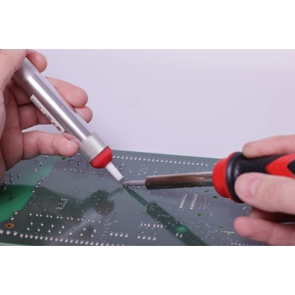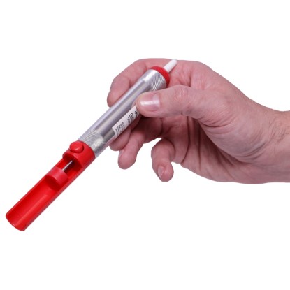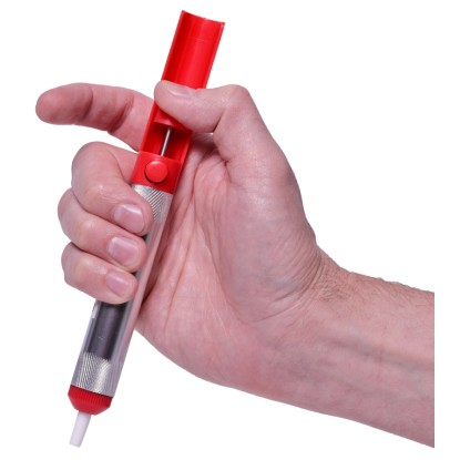 Die Pumpe besteht aus robustem Kunststoff und Metall, wiegt nur 30 g und ist einfach zu bedienen. Sie eignet sich perfekt für präzises Arbeiten, insbesondere beim Auslöten von Bauteilen und dem Entfernen überschüssigen Lotes.