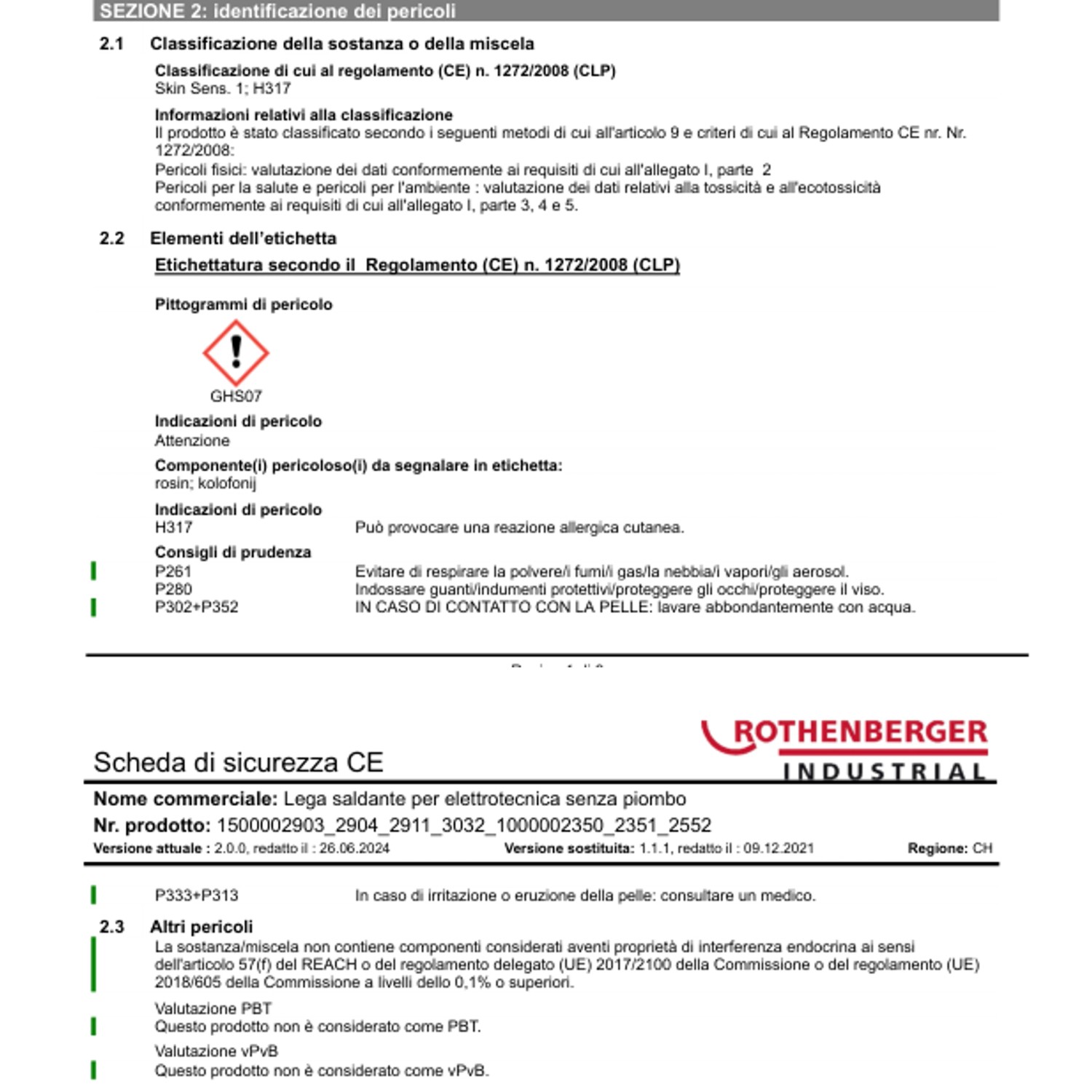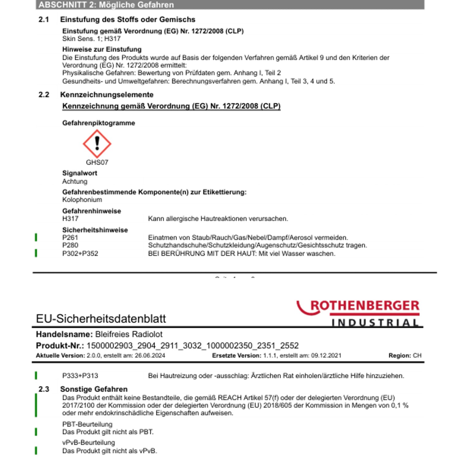 Das bleifreie Radiolot von Rothenberger Industrial ist mit integriertem Flussmittel ausgestattet und eignet sich besonders für feine Lötarbeiten in der Elektronik, Elektrotechnik und im Fernmeldebau. Es ermöglicht präzise Verbindungen an Kupfer, Messing, Silber, Cadmium, Nickel und Zinn und kann vielseitig bei der Elektromontage, im Kfz-Bereich sowie bei der Fertigung von Baugruppen eingesetzt werden. Das Lot erfüllt die Anforderungen nach DIN EN 9453 und DIN EN ISO 9453 und schmilzt kontrolliert bei einer Temperatur von 227 °C. Bei Kontakt mit der Haut kann es allergische Reaktionen hervorrufen, daher sind geeignete Schutzmassnahmen wie Handschuhe zu beachten.