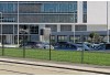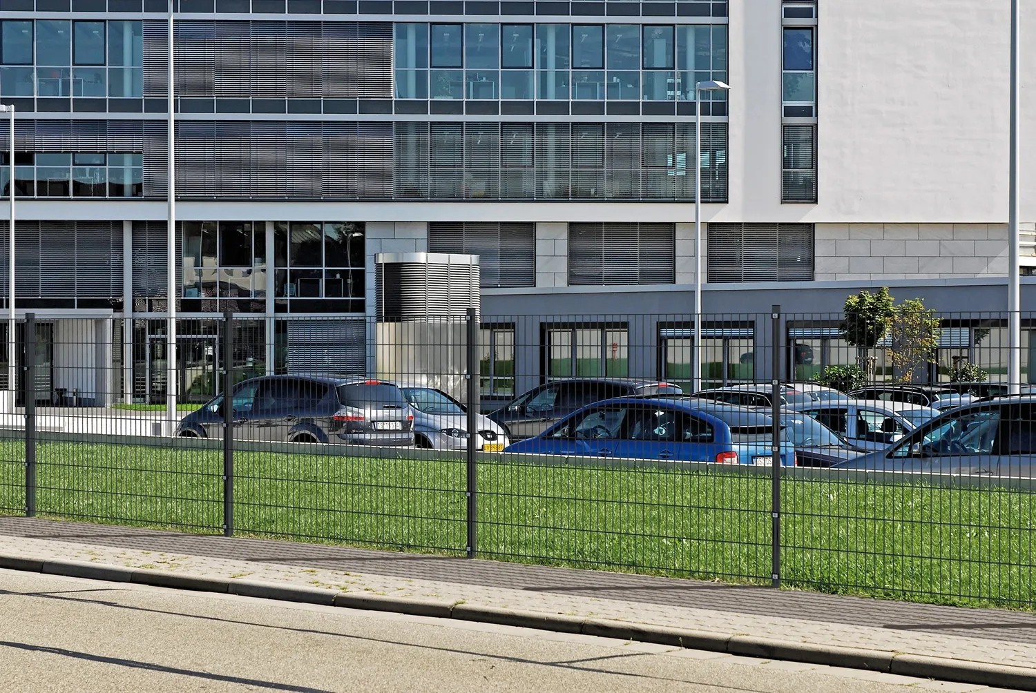 Ein Zaunpfosten inkl. Klemmlasche für die Befestigung von Doppelstab-Gittermatten aus rohem Stahl, die Oberfläche ist sendzimirverzinkt und in Anthrazit kunststoffbeschichtet.