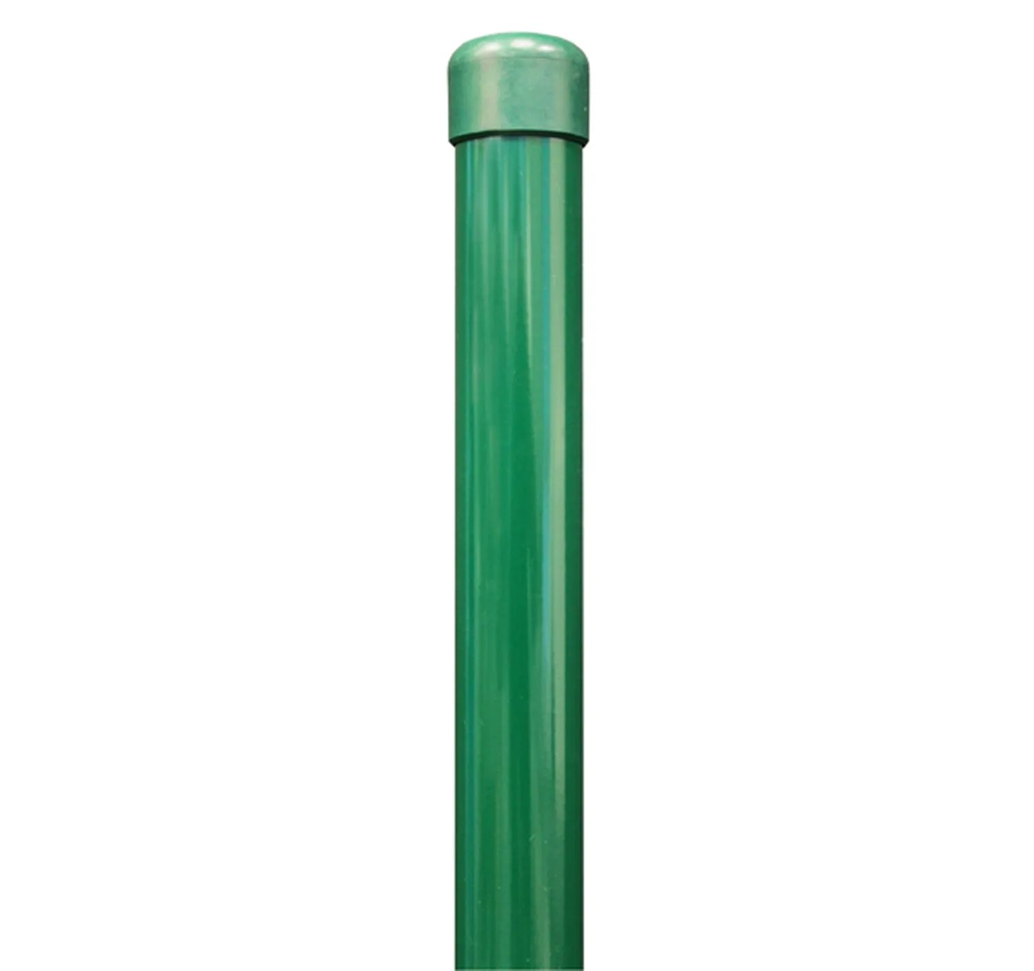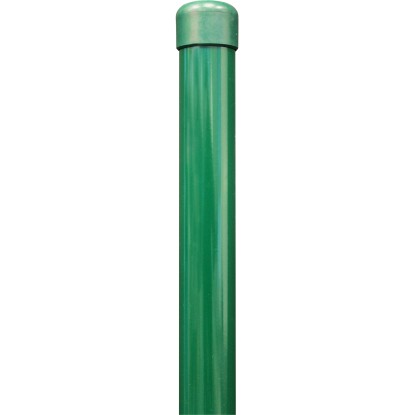 Der Zaunpfosten ist ungelocht und mit einer Pfostenkappe aus Kunststoff versehen. Sehr guter Halt im Betonfundament, da das Rohr am unteren Ende eingedrückt ist.